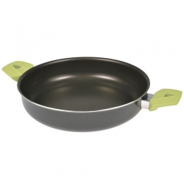 Pánev 24 cm bez poklice od italské značky Moneta™ Vyrobeno v Itálii Teflonový povrch Materiál hliník Extrémně odolný proti poškrábání. Pogumované rukojeti v zelené barvě. Vhodné na všechny typy povrchů mimo indukčního. Vhodné do myčky na nádobí. Rozměr: 24 x 5.5 cm, objem: 1.8l, váha: 650 g.