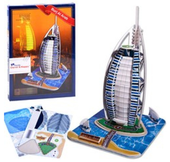 Prostorové 30dílné puzzle s motivem hotelu Burj Al Arab jistě potěší každého malého nadšence do 3D skládaček a modelování.Hotel Burj Al Arab se nachází v Dubaji a je součástí rezortního komplexu. Hotelová budova stojí na umělém ostrově vzdáleném 280 metrů od pláže v zálivu. Je to nejvyšší budova na světě ve tvaru plachty, v níž nejsou žádné kanceláře, ale hotelové pokoje.Skládačky nevyžadují žádné nářadí, snadno se sestavují a nakonec je loď skvělým dekorativním kouskem. Dílky skládačky jsou umístěny na deskách ze speciálního kartonu.