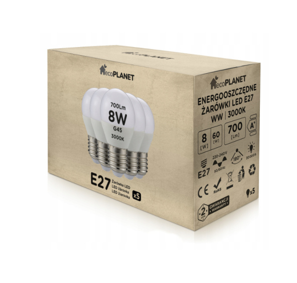Popis produktu 5x LED žárovka E27 - G45 - 8W - 700lm - teplá bílá