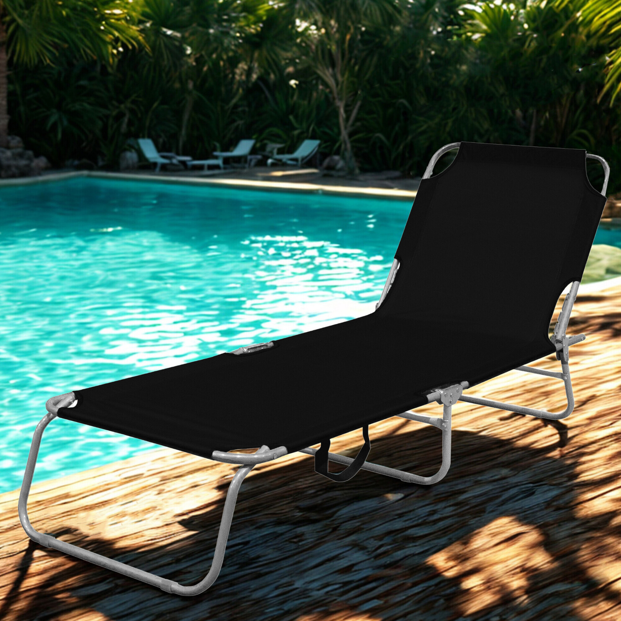 Skládací zahradní lehátko se zpevněnou ocelovou konstrukcí, v moderním designu, vhodné pro zahrady, na kempování či pláže.