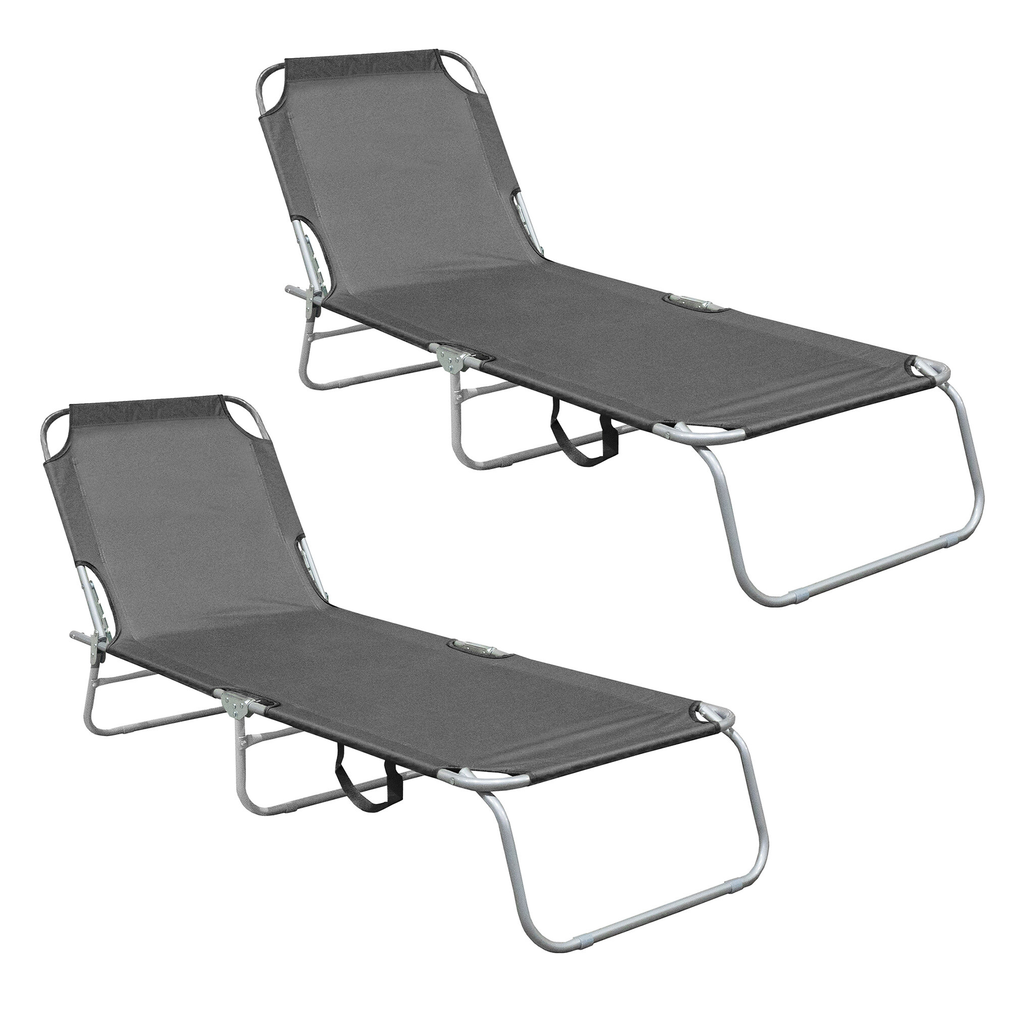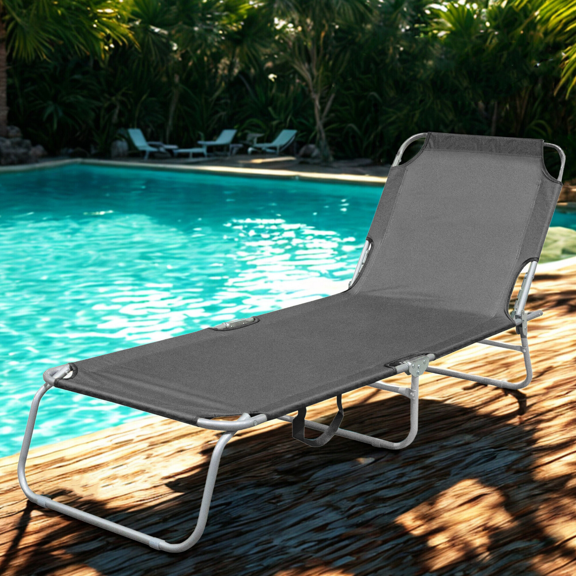Skládací zahradní lehátko se zpevněnou ocelovou konstrukcí, v moderním designu, vhodné pro zahrady, na kempování či pláže.
