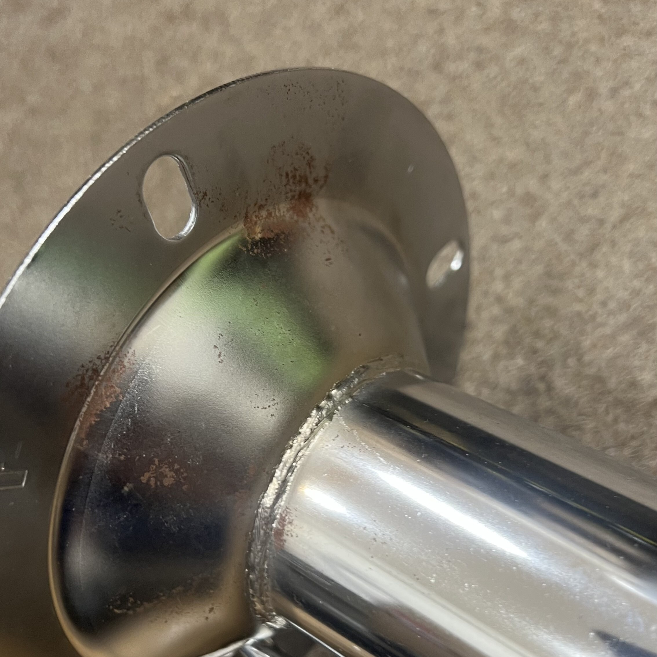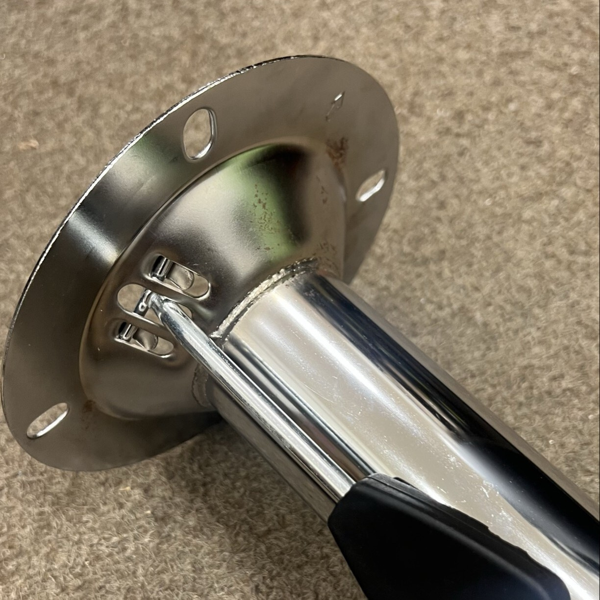 Židle má estetické vady: sedák je poškrábaný a podnožka je mírně rezavá.
