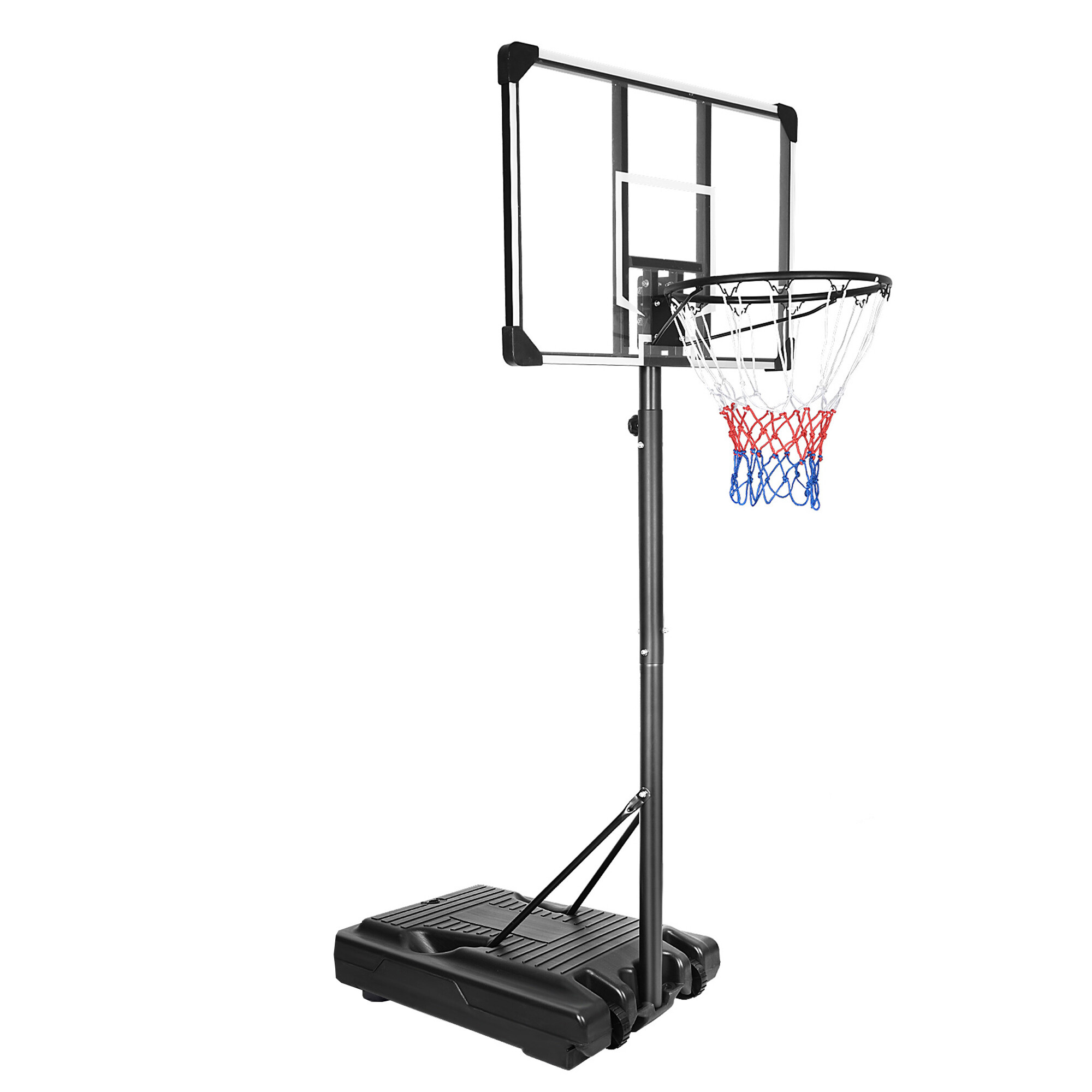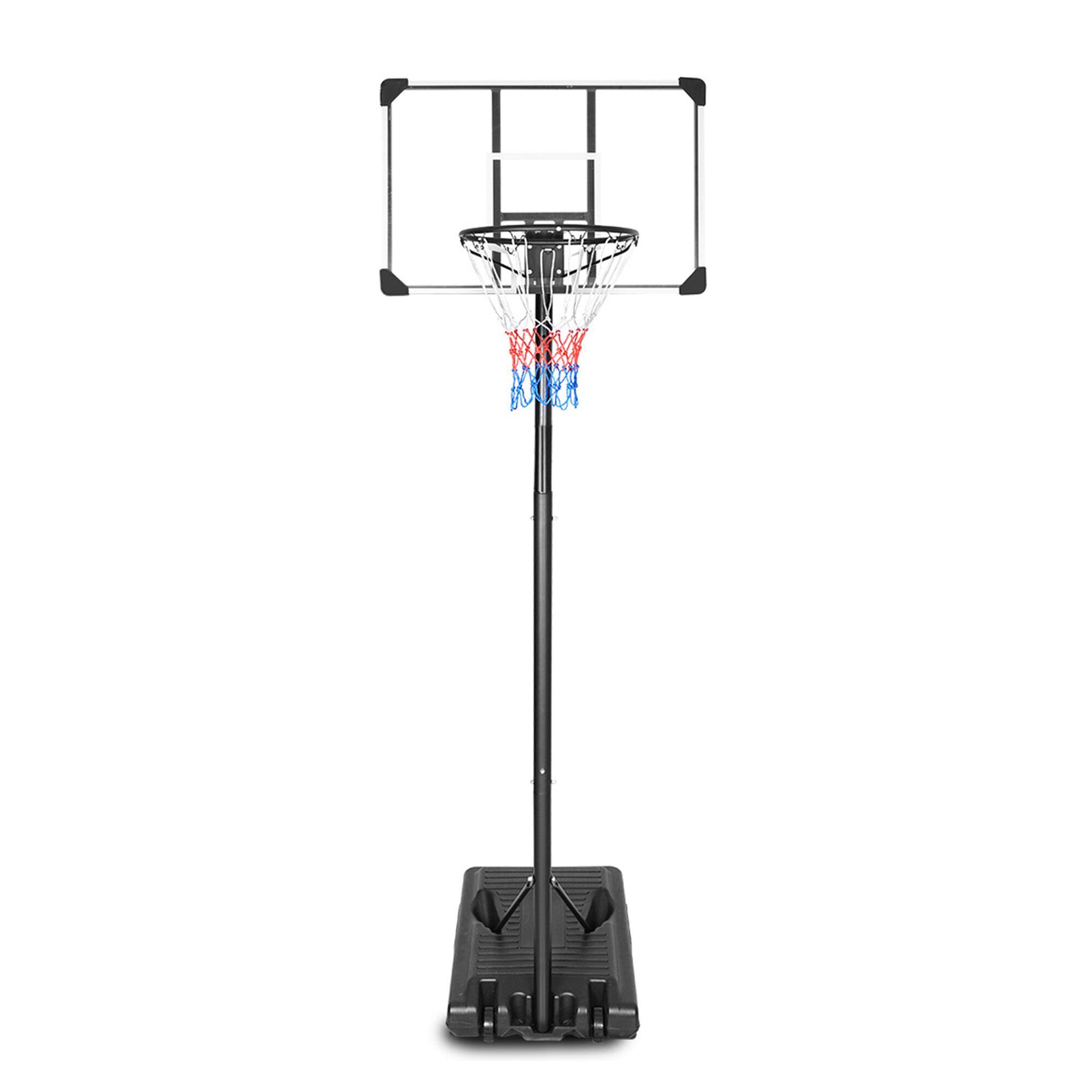 Mobilní basketbalový koš s nastavitelnou výškou, pevnou plastovou deskou a obroučkou se sítí.