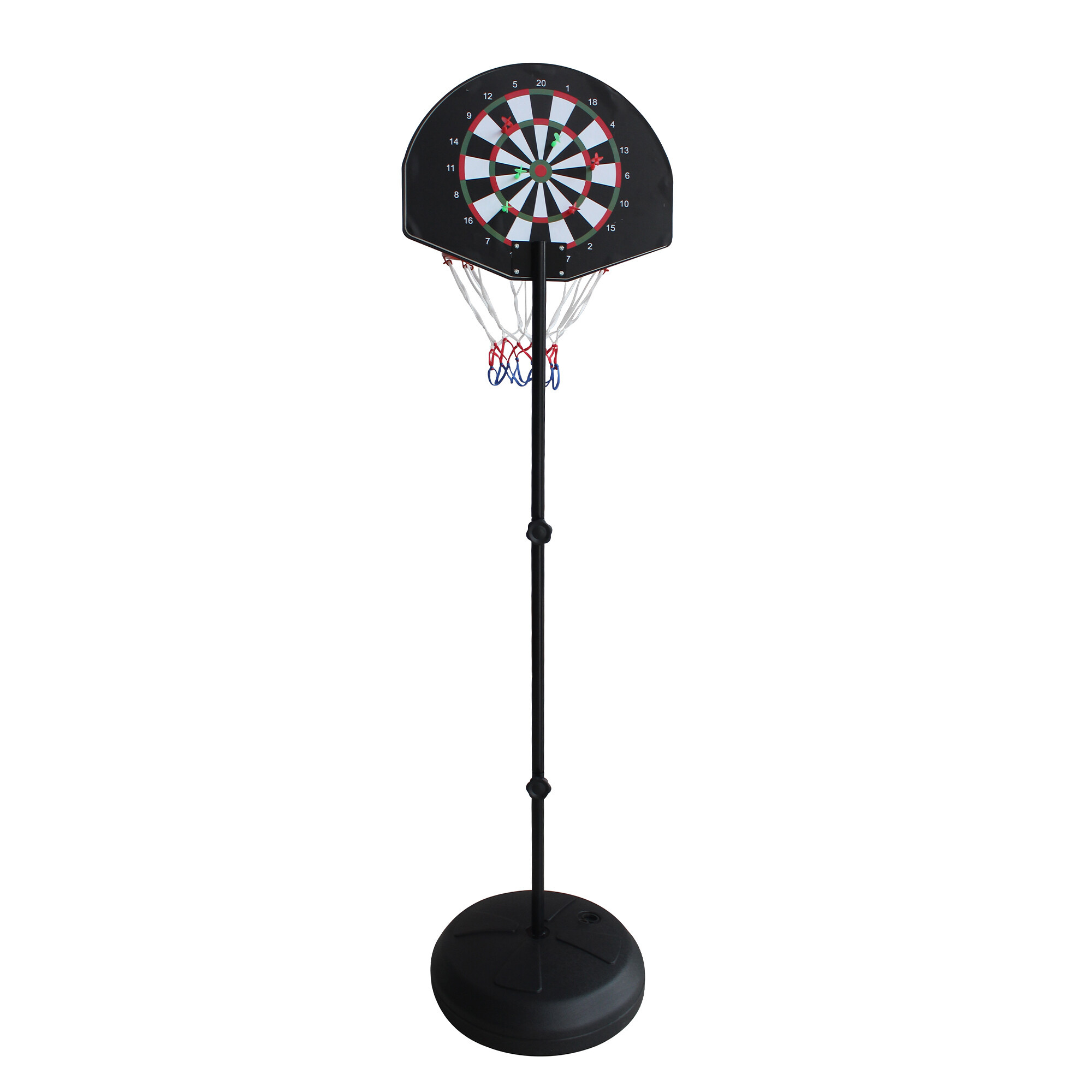 Stačí stojan jen otočit a z basketbalu se stane zábavná hra se šipkami. Kromě stojanu s terčem na šipky a basketbalovým košem se síťkou sada obsahuje také 6 šipek. Šipky jsou magnetické - na konci ploché, a proto je mohou používat děti již od 5 let.