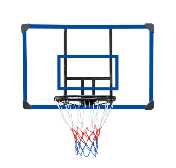 Na odrazové desce s modrými čarami je upevněn basketbalový koš s ocelovou obroučkou o průměru 45 cm lakovanou práškovým lakem a se síťkou odolnou proti povětrnostním vlivům.