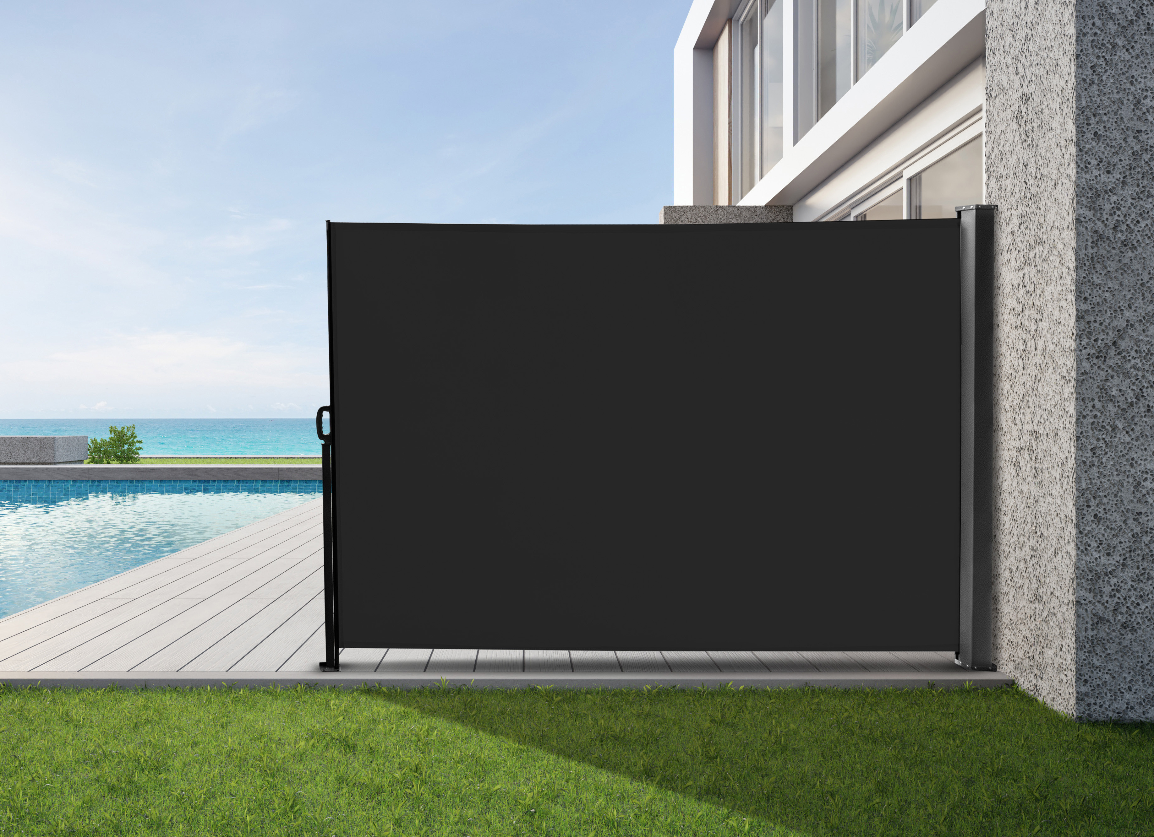 Boční markýza vás venku chrání před větrem, sluncem nebo i před nechtěnými pohledy kolemjdoucích sousedů.