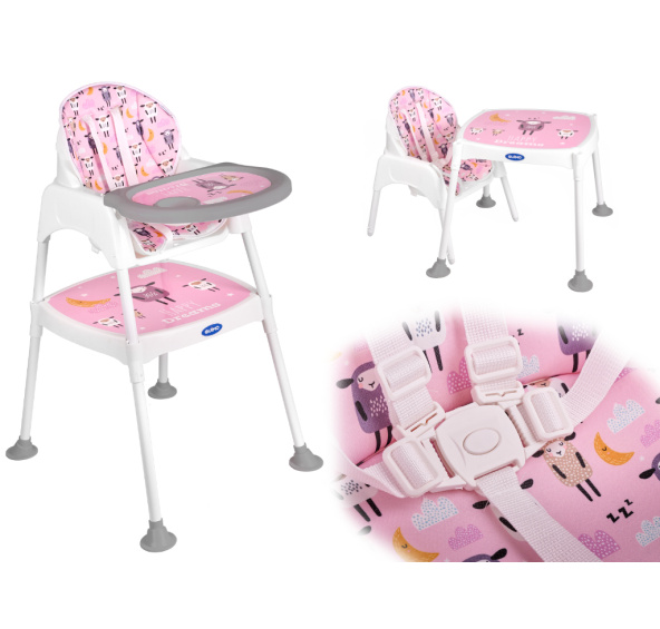 Křeslo má až tři různé funkce! lze ji použít jako židličku na krmení pro děti od 6 do 36 měsíců, a když batole příliš vyroste, můžete výrobek přeměnit nažidličku a stolek. tato kombinace vám umožní nejen pohodlně stolovat, ale také skvěle kreslit a hrát si! V této podobě bude bezproblémově sloužit až do šesti let!