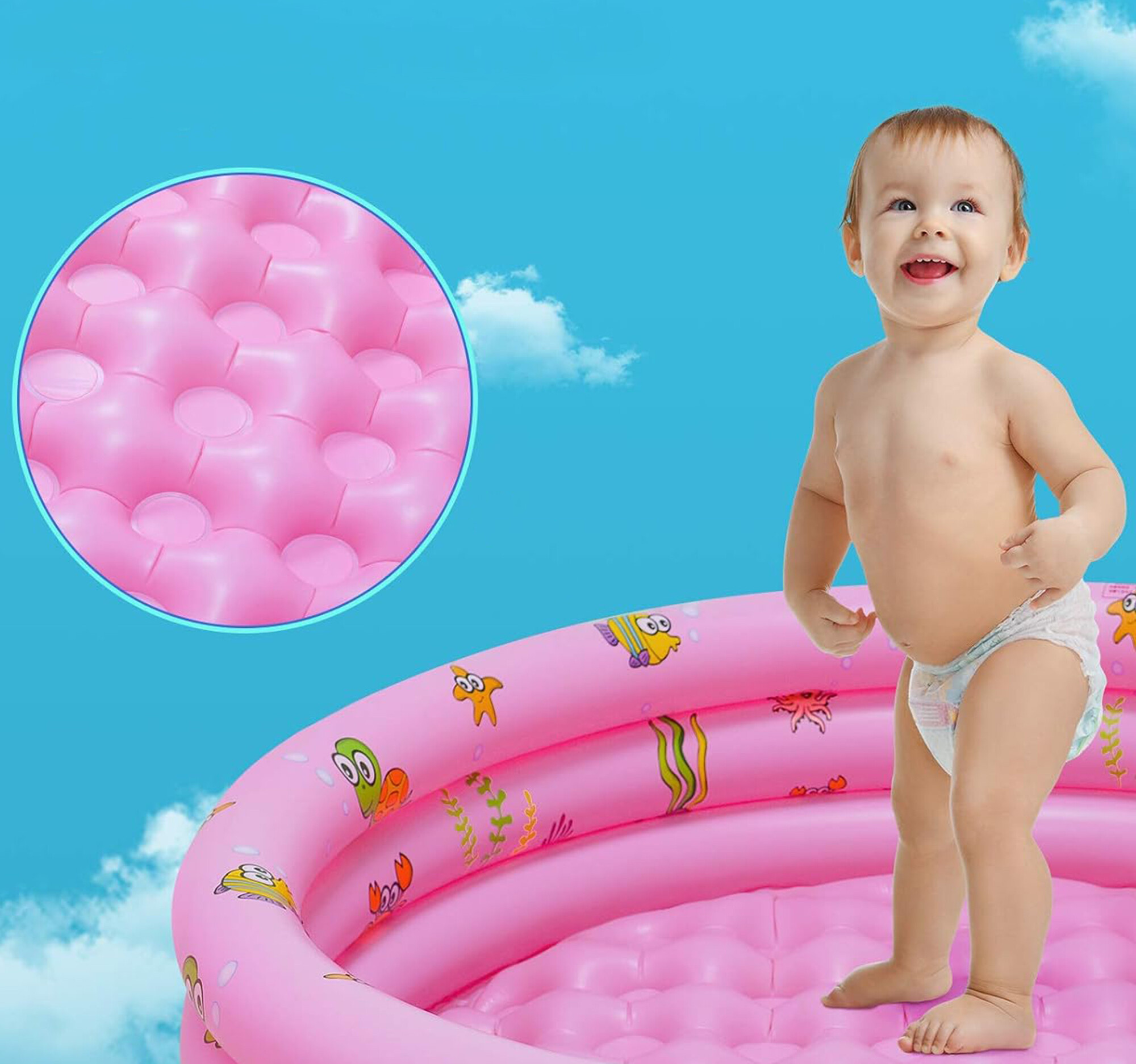 Bazén je vyroben z kvalitního PVC, který je odolný a vydrží dlouhá léta. Měkké nafukovací dno bazénu zajišťuje pohodlí a bezpečnost vašich dětí.