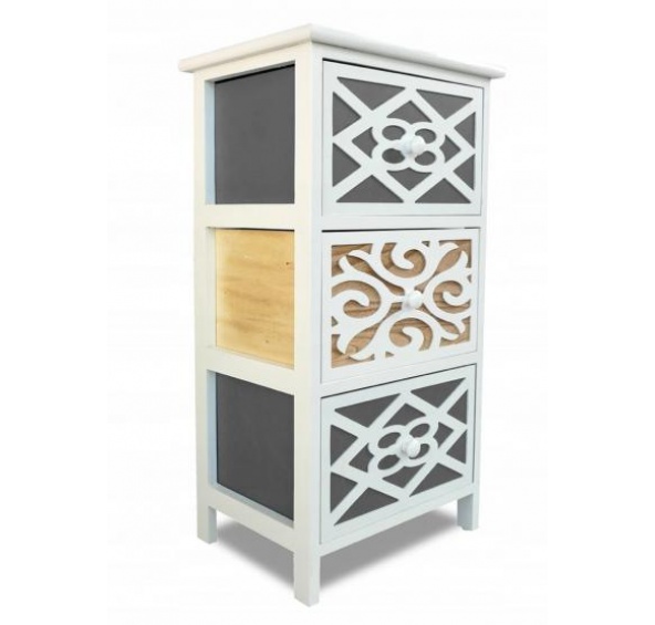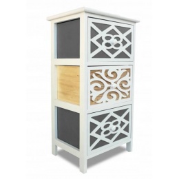 Komoda se skládá ze tří velkých a prostorných zásuvek, které jsou na přední straně zdobené nápaditým ornamentem.