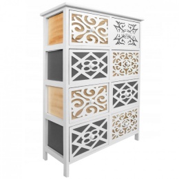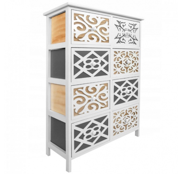 Komoda se skládá z osmi velkých a prostorných zásuvek, které jsou na přední straně zdobené nápaditým ornamentem.