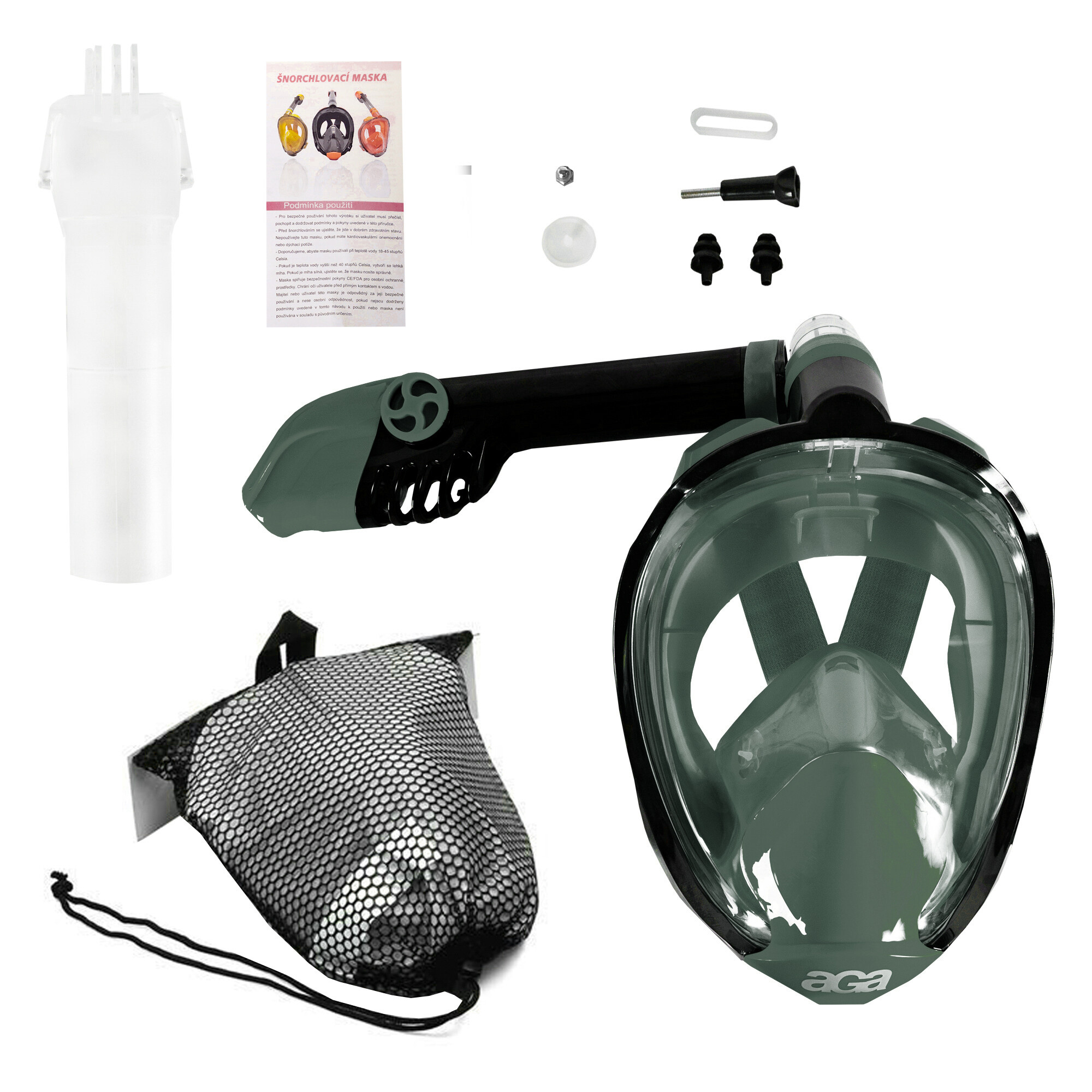 Potápěčská maska Aga je vyrobena z polykarbonátu a nabízí enormní ochranu proti vniknutí vody stejně jako komfortní nošení. Poskytuje 180° zorný úhel s cirkulačním dýchacím systémem. Čerstvý vzduch nasáváte jak nosem, tak pusou, ten potom vychází ven jednosměrnými otvory v masce.
