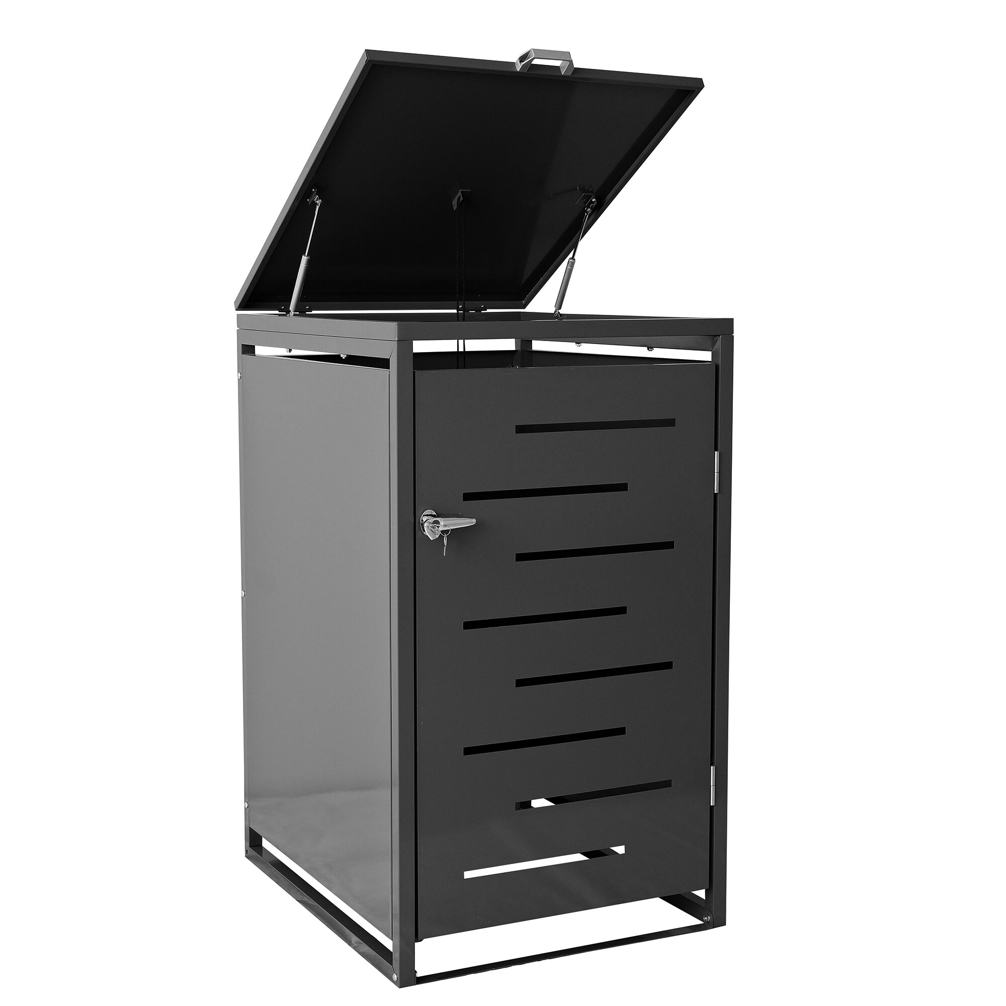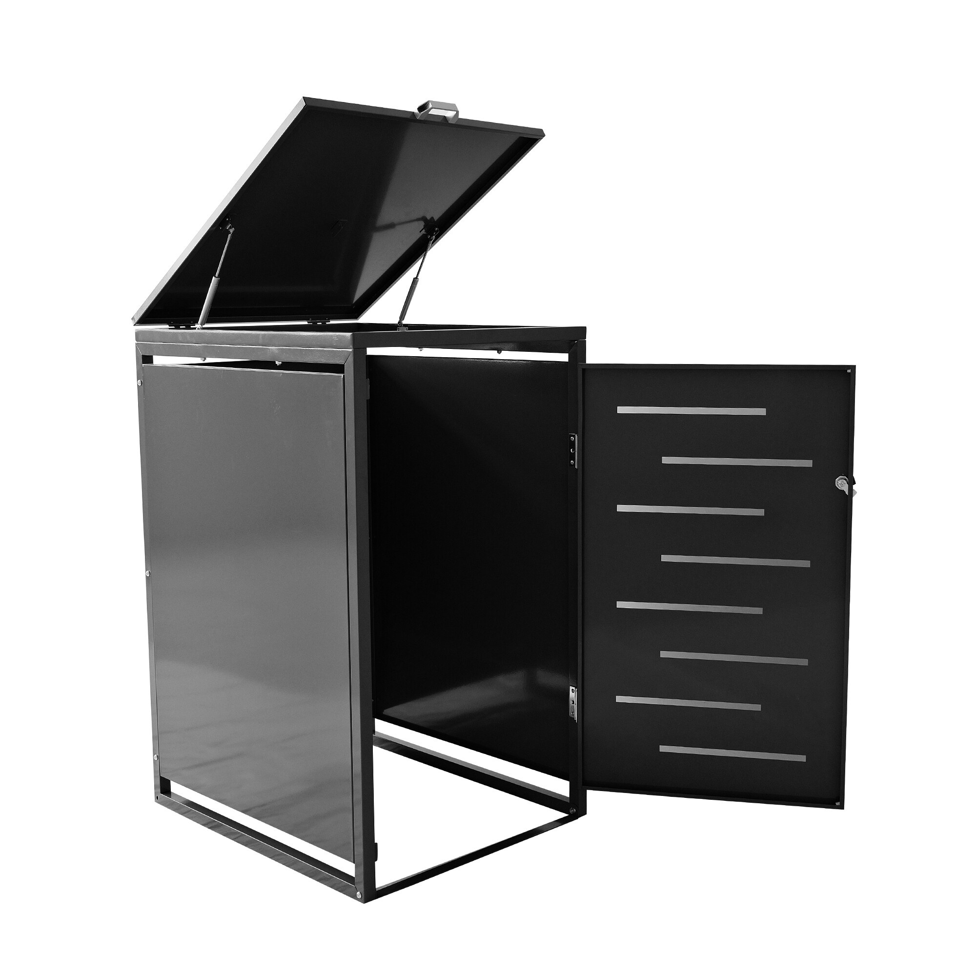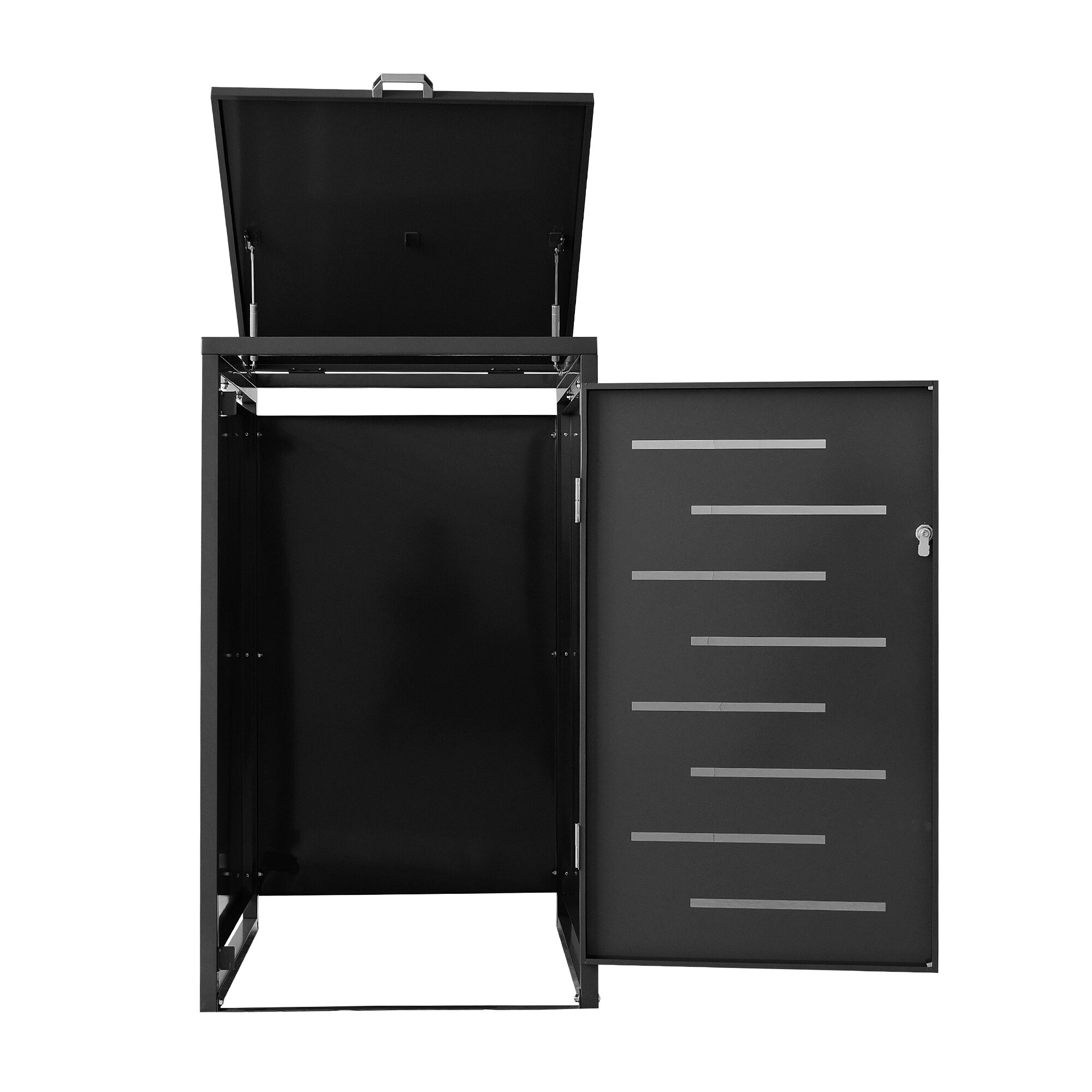 Manipulace s popelnicí je díky předním dvířkům s madlem velmi snadná. Popelnici jednoduše umístíte do boxu a stejně snadno ji i vyjmete. Pro ještě pohodlnější plnění popelnice je přístřešek vybaven otevíratelným víkem s madlem a plynovou vzpěrou, která usnadňuje otevírání a zavírání víka.
