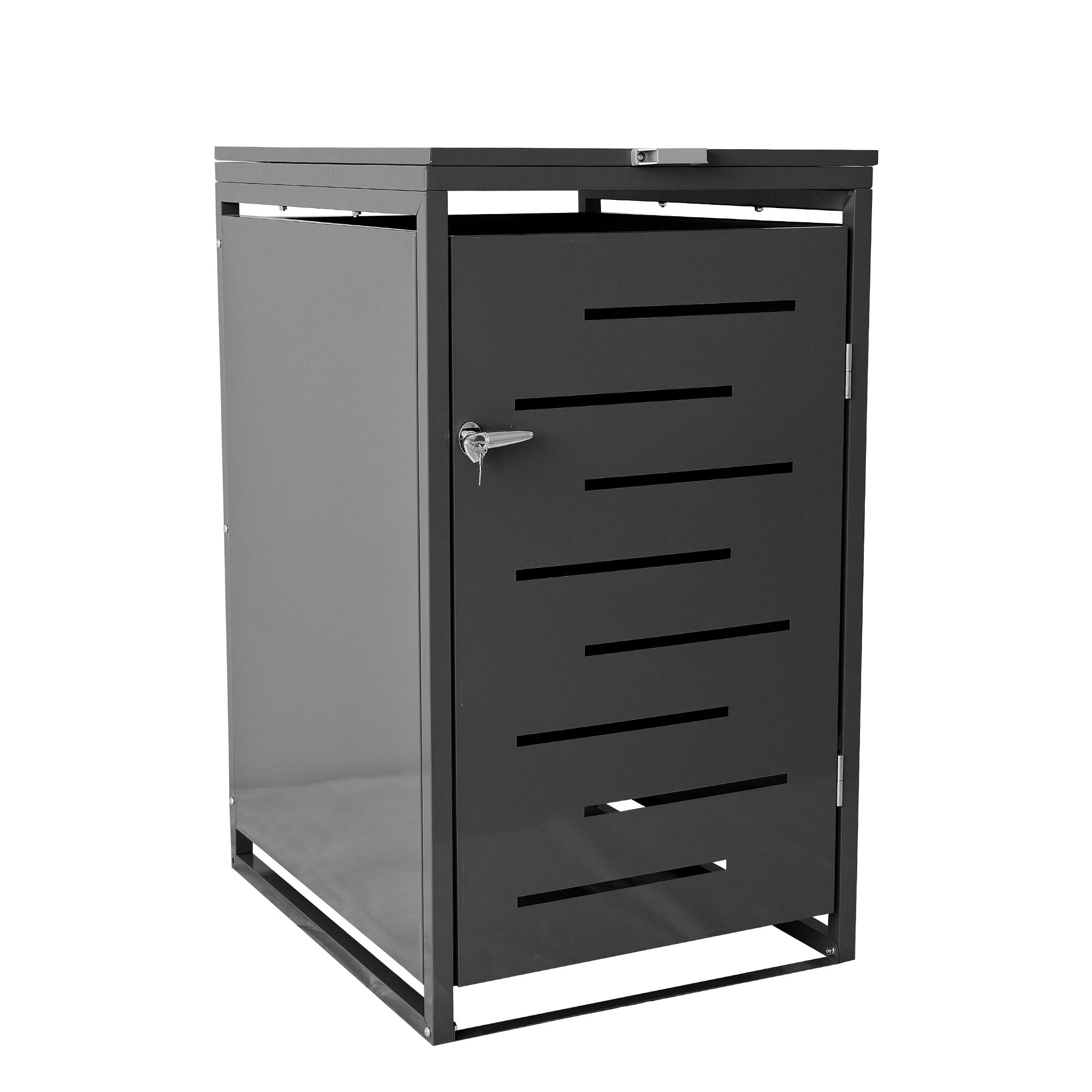 Přístřešek je vyroben z oceli s práškovým lakem, což zajišťuje jeho dlouhou životnost a odolnost vůči povětrnostním vlivům. Antracitová barva dodává boxu moderní a sofistikovaný vzhled. Dekorativní ventilační otvory nejenže přidávají na estetice, ale také zajišťují dostatečné větrání.