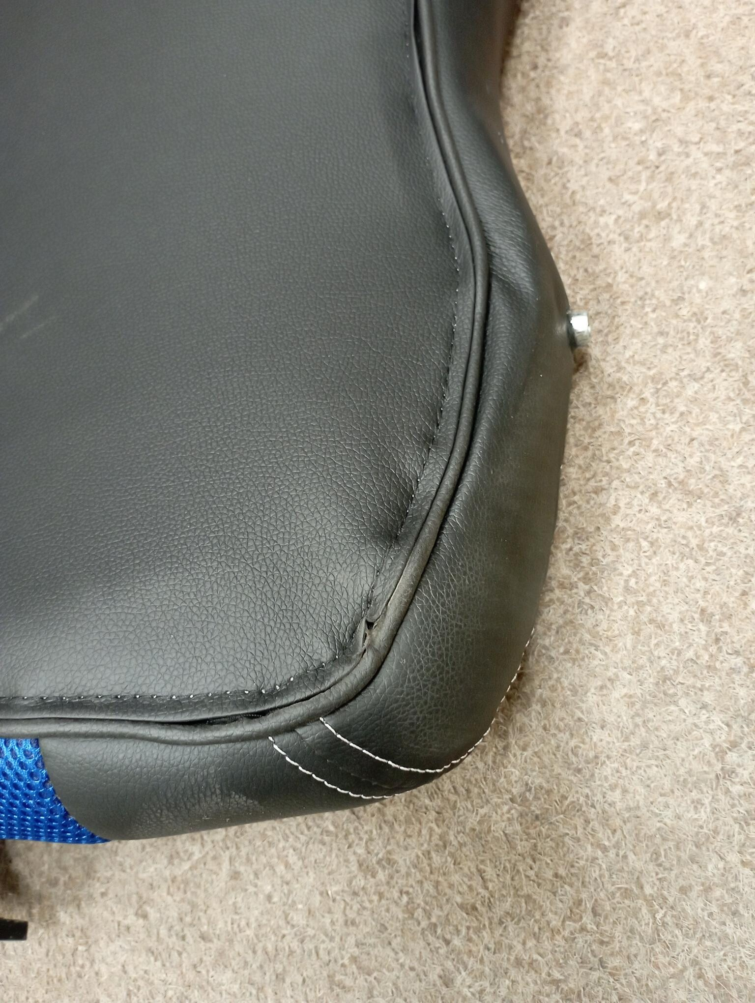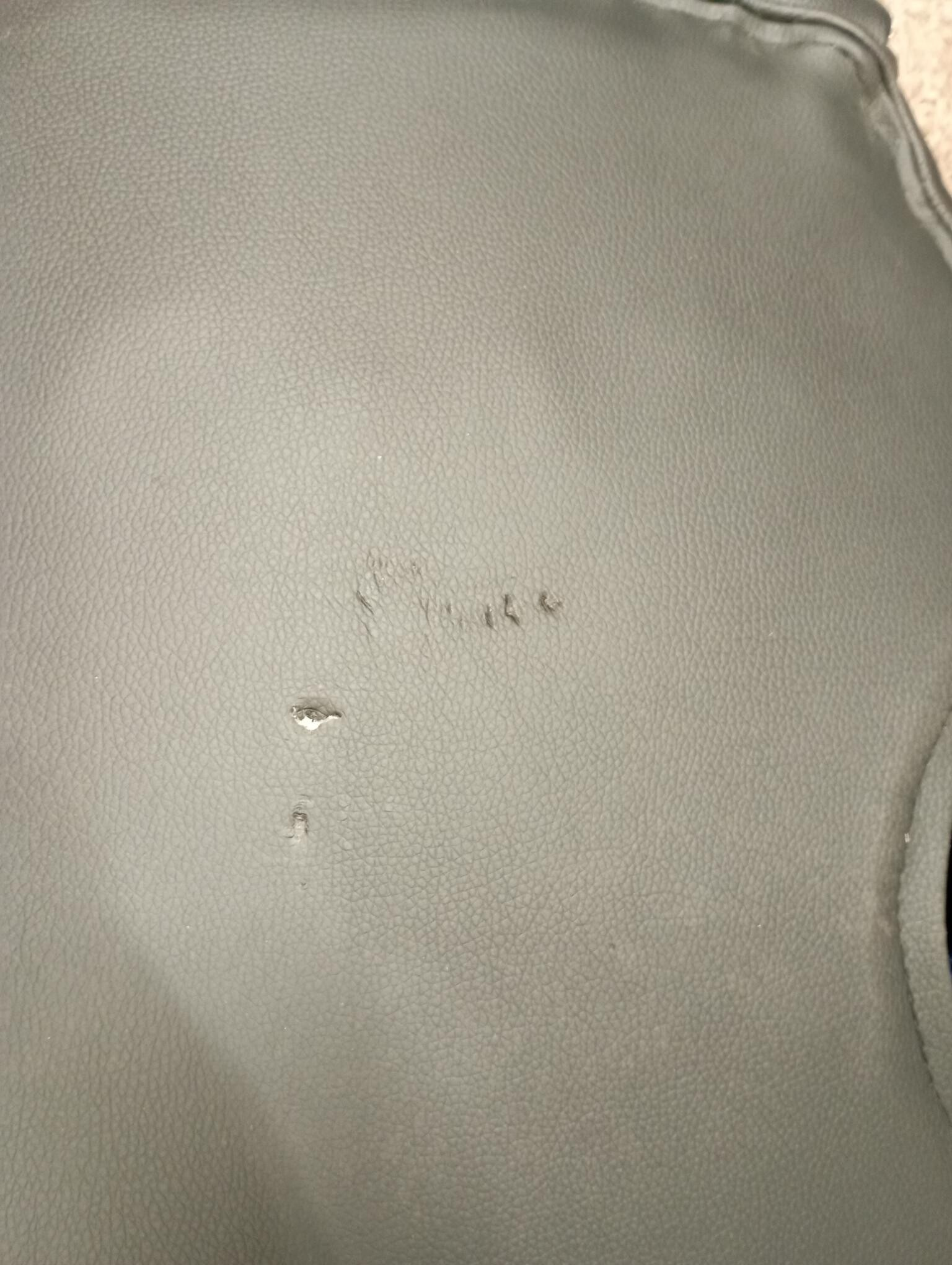 Křeslo je kompletní a plně funkční. Bylo montováno a zadní strana opěradla je poškozená – díra v polstrování.