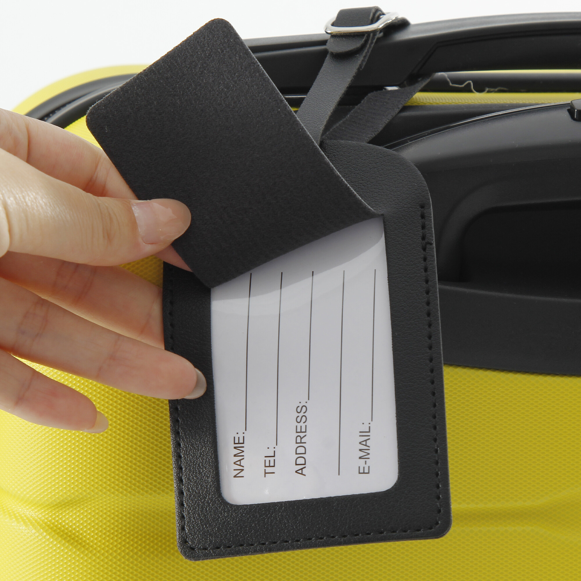 Upínací pásek s bezpečnostní sponou zaručuje, že jmenovka zůstane na vašem zavazadle pevně uchycena.