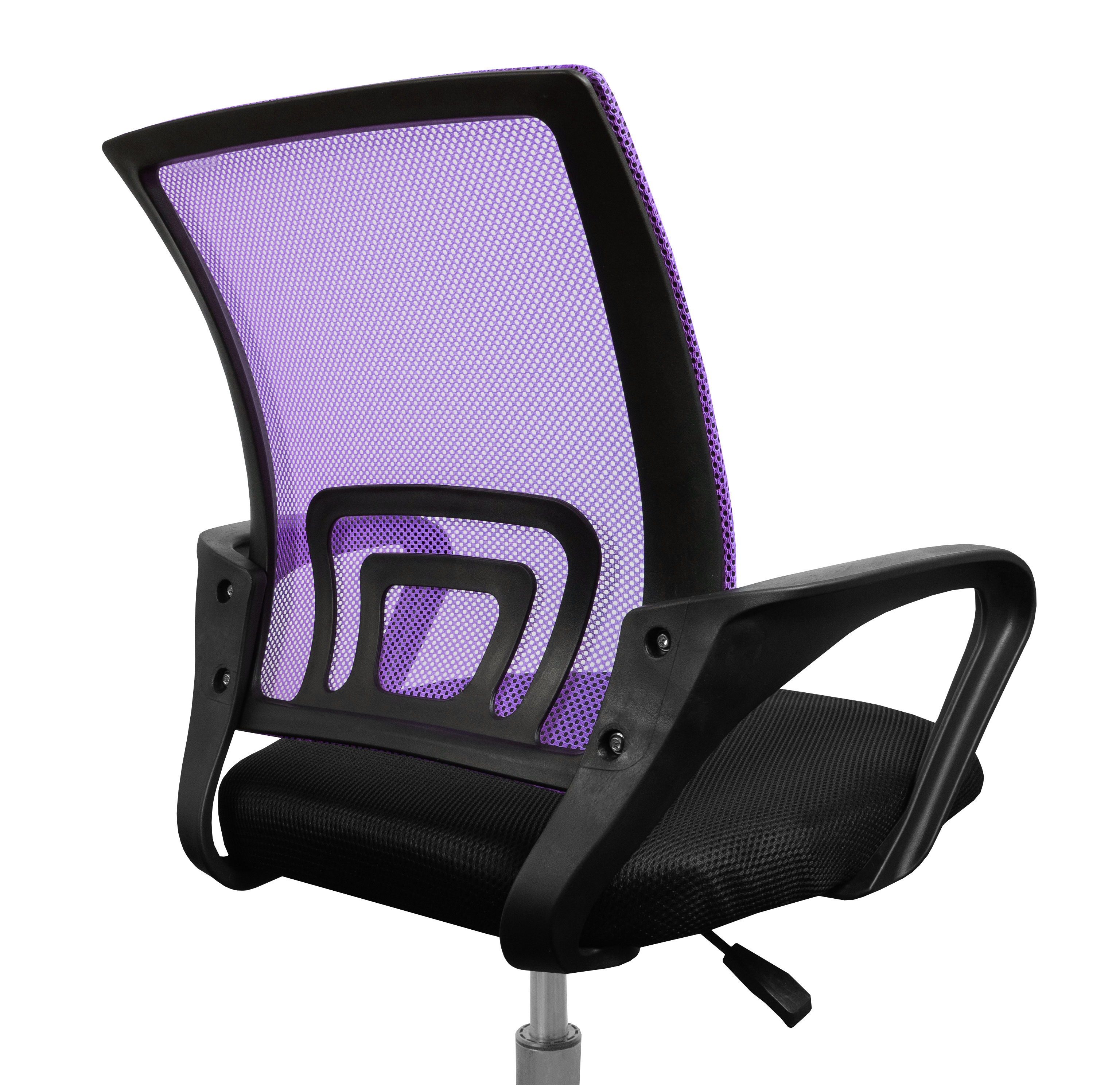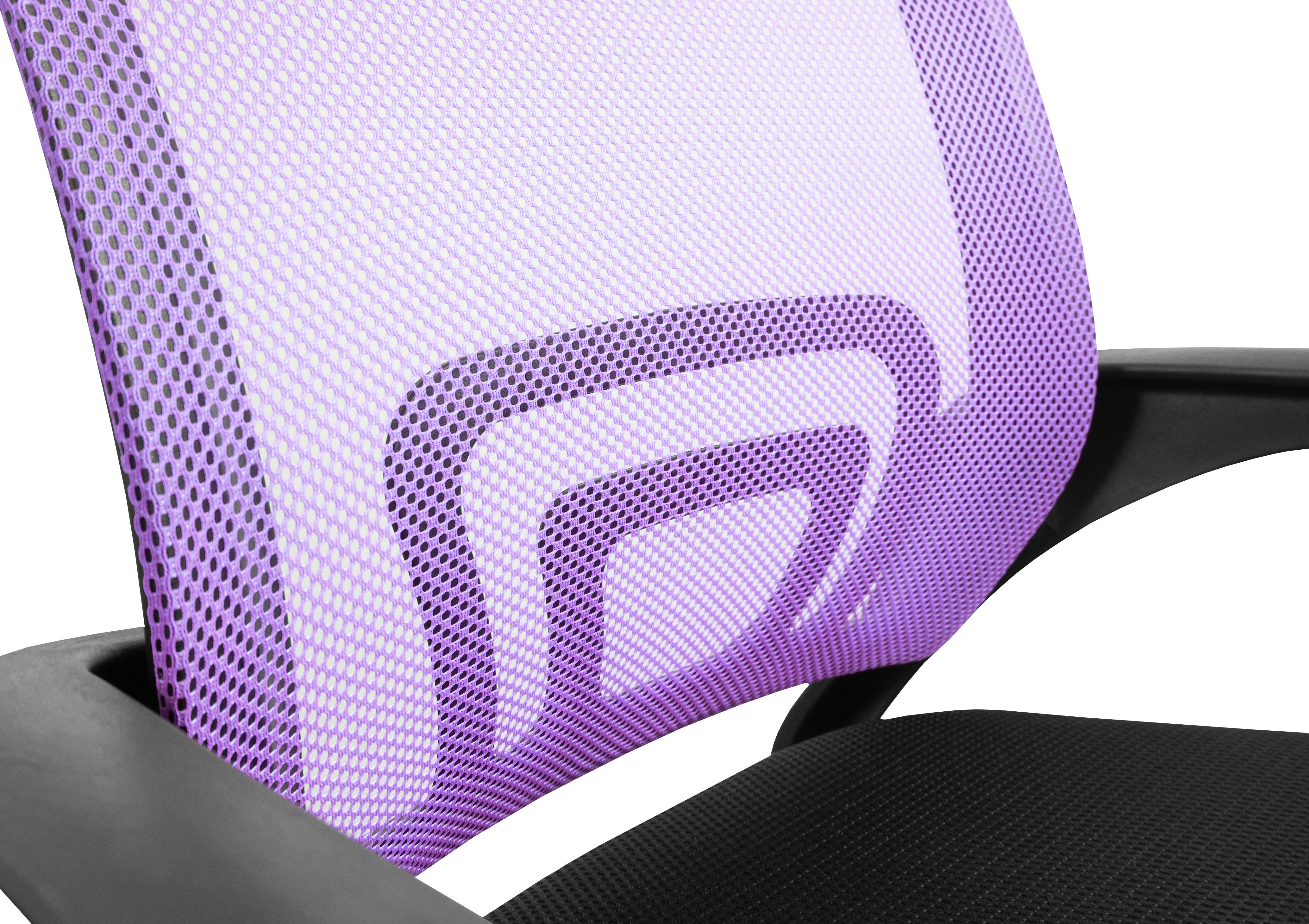 Kancelářská židle bez podhlavníku, která je vyrobená v černo - fialové barvě v kombinaci síťoviny a plastu.