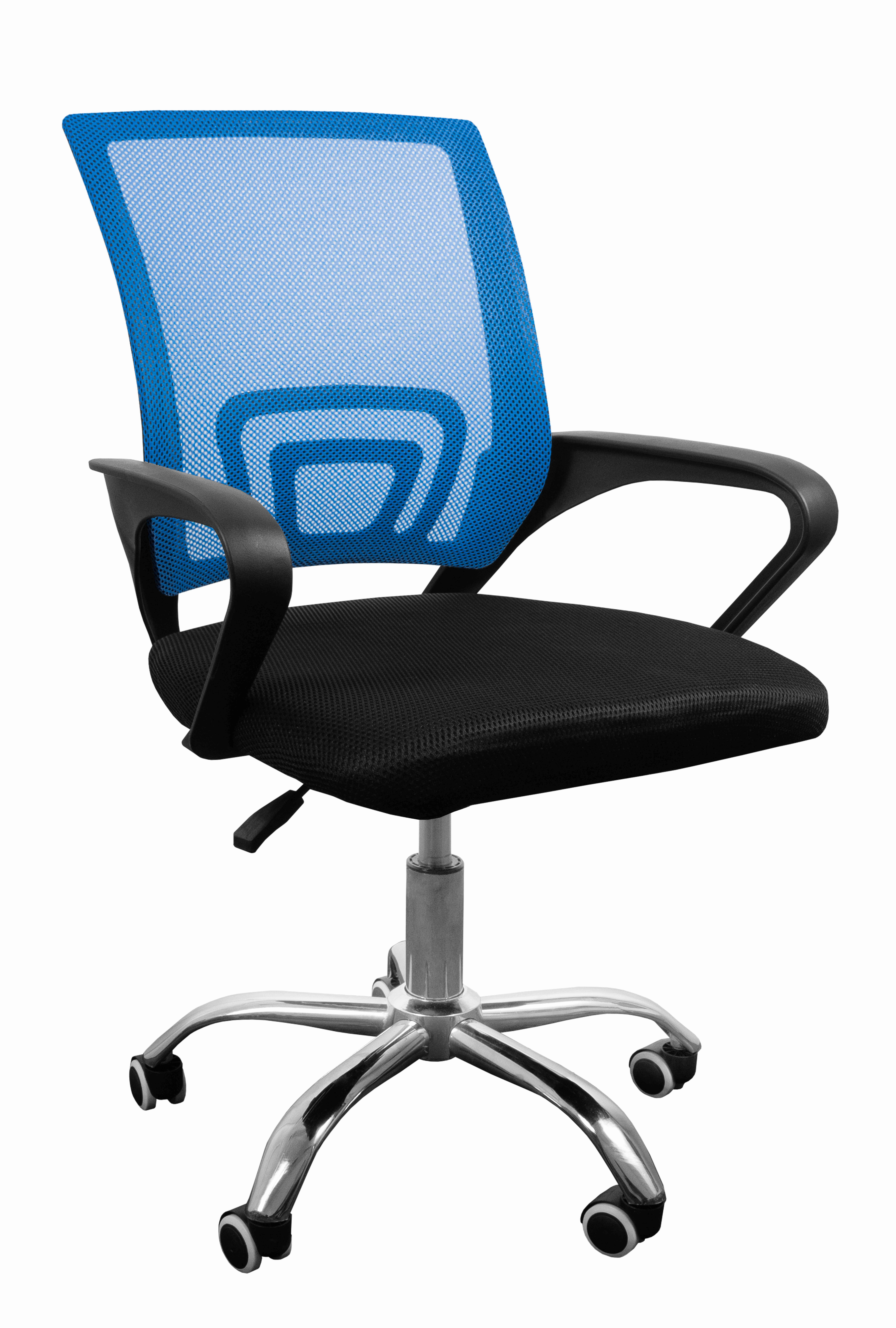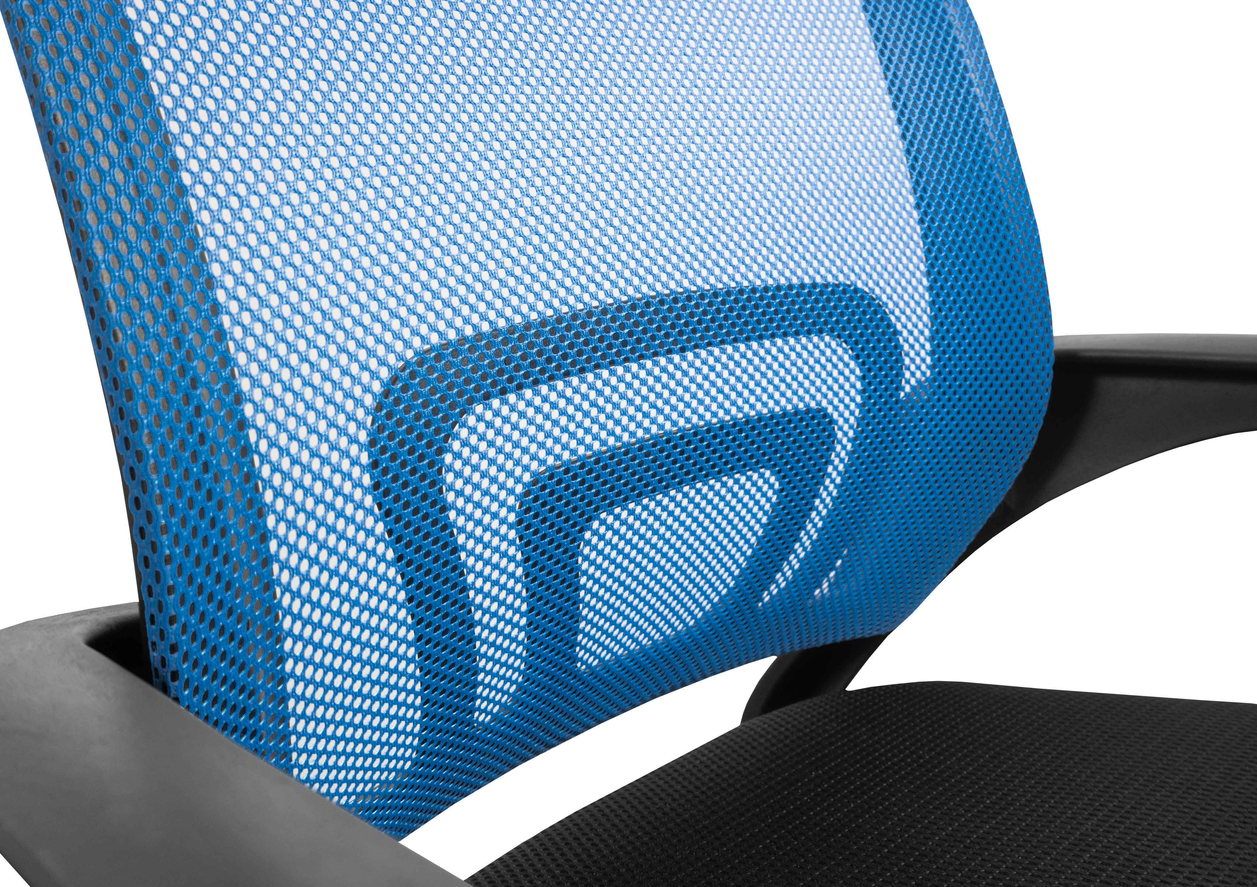 Kancelářská židle bez podhlavníku, která je vyrobená v černo - modré barvě v kombinaci síťoviny a plastu.