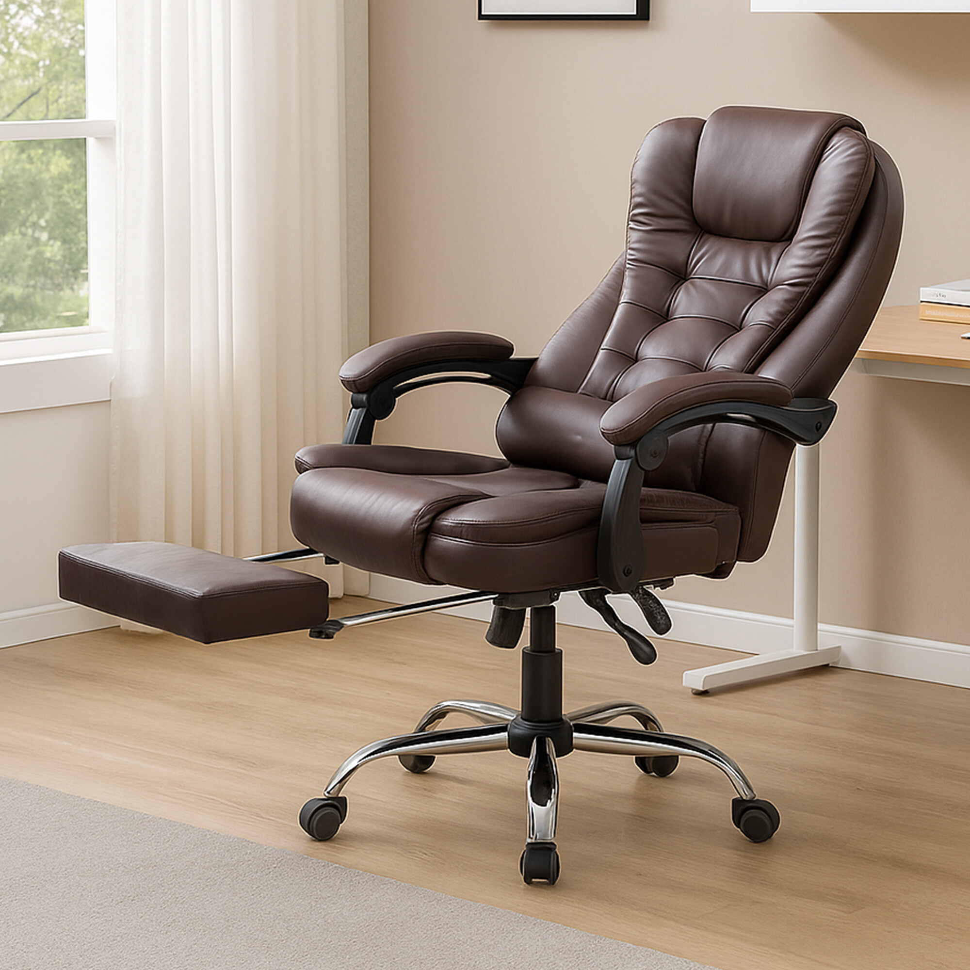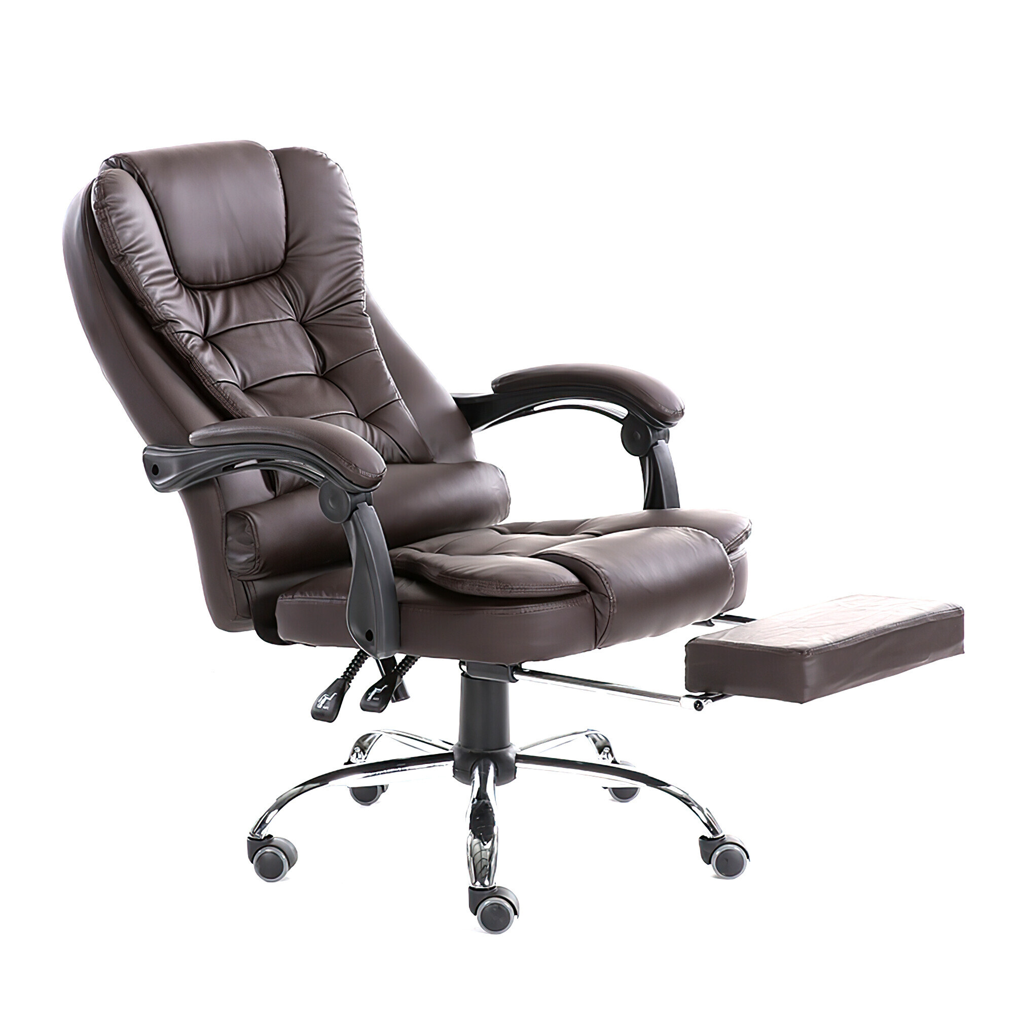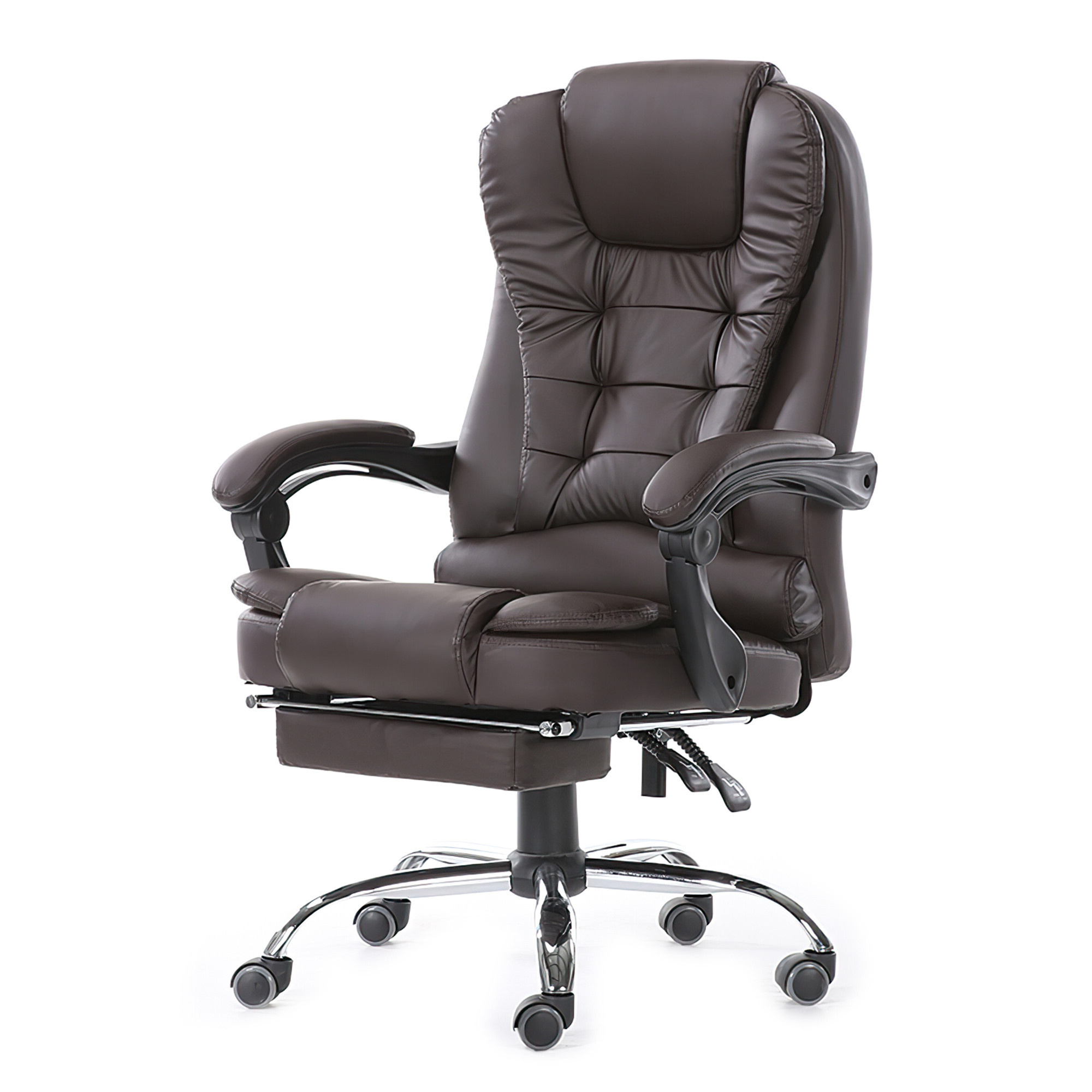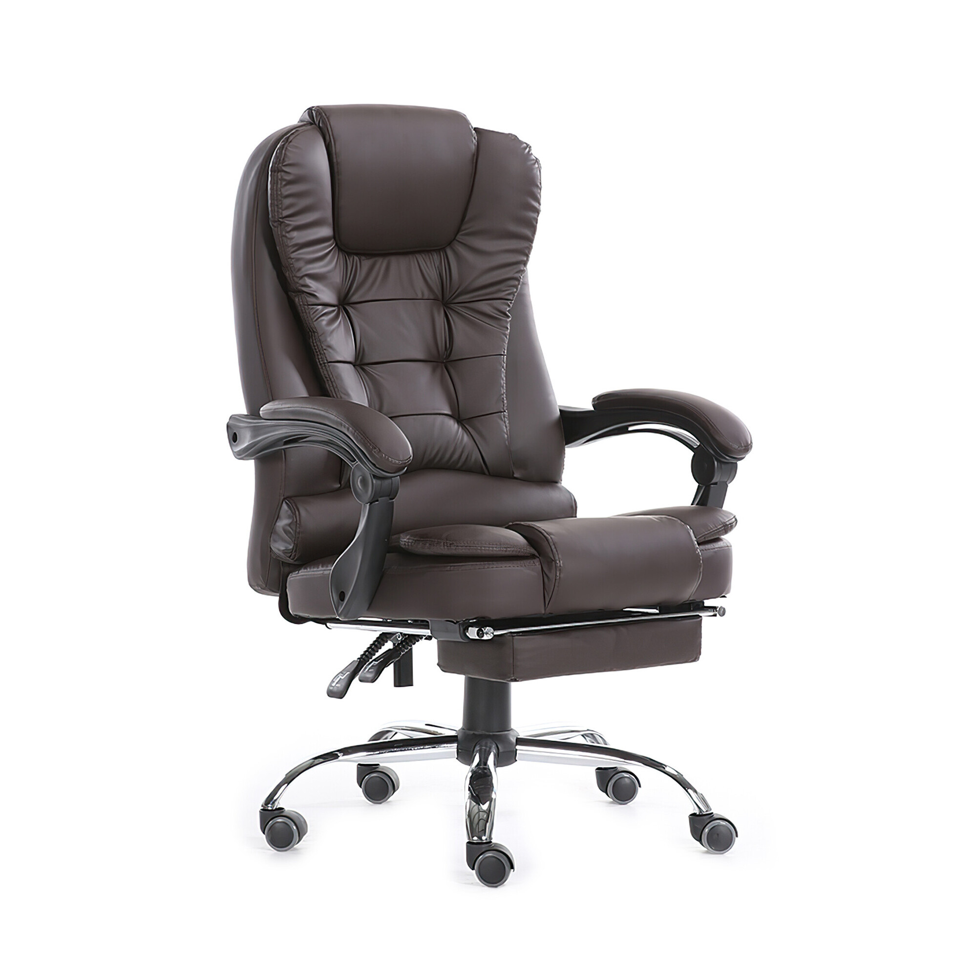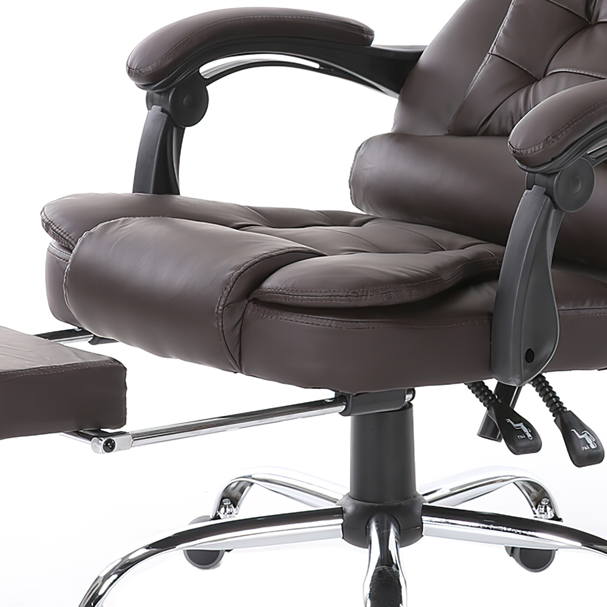 K čalounění opěráku křesla je použita velmi pevná eko kůže v elegantní černé barvě. Tuto eko kůži také najdeme na sedáku, a dokonce i na područkách. Eko kůže maximalizuje pohodlí a celé konstrukci přidává na luxusu. Co se týče konstrukce sedáku, tak je taktéž vybaven polstrovaným polštářem, který se postará o další komfort. Díky výsuvné podnožce si můžete dopřát relaxaci i během práce.