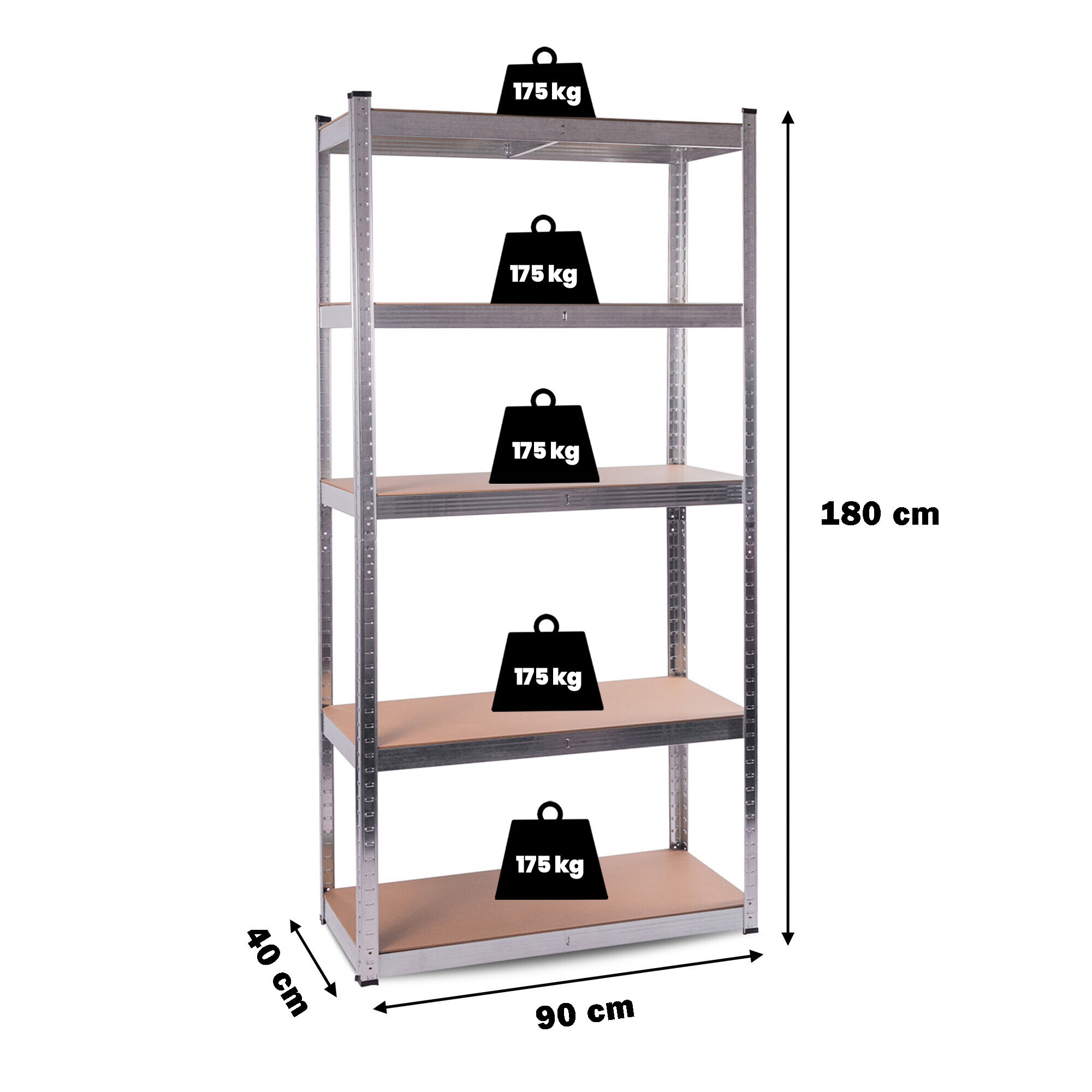 Na výšce cca 180 cm máte k dispozici 5 polic z mdf, které lze výškově vložit dle potřeby. Rám z galvanizované oceli ve stříbrné barvě zaručuje stabilitu a velkou nosnost cca 875 kg (na každou polici připadá cca 175 kg).