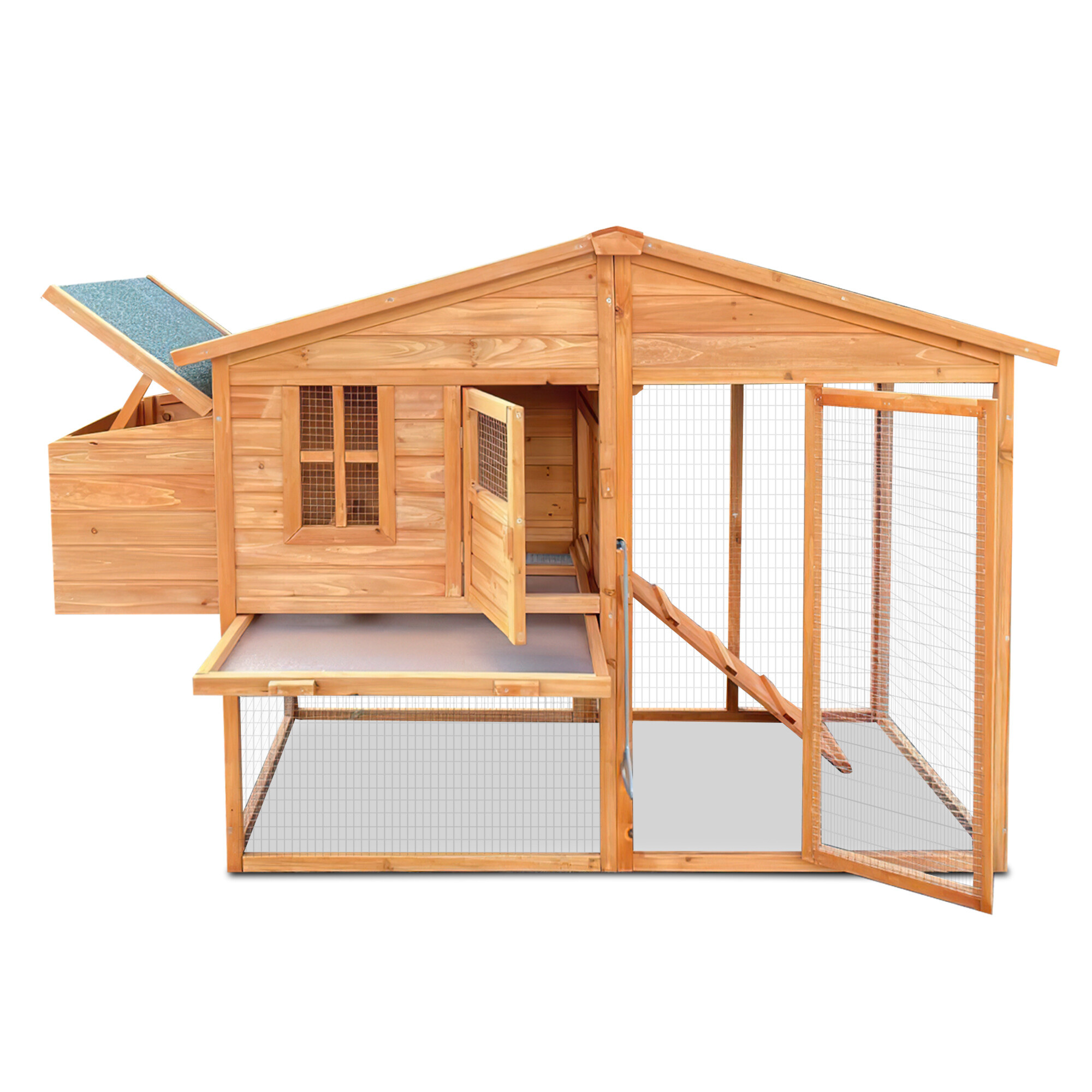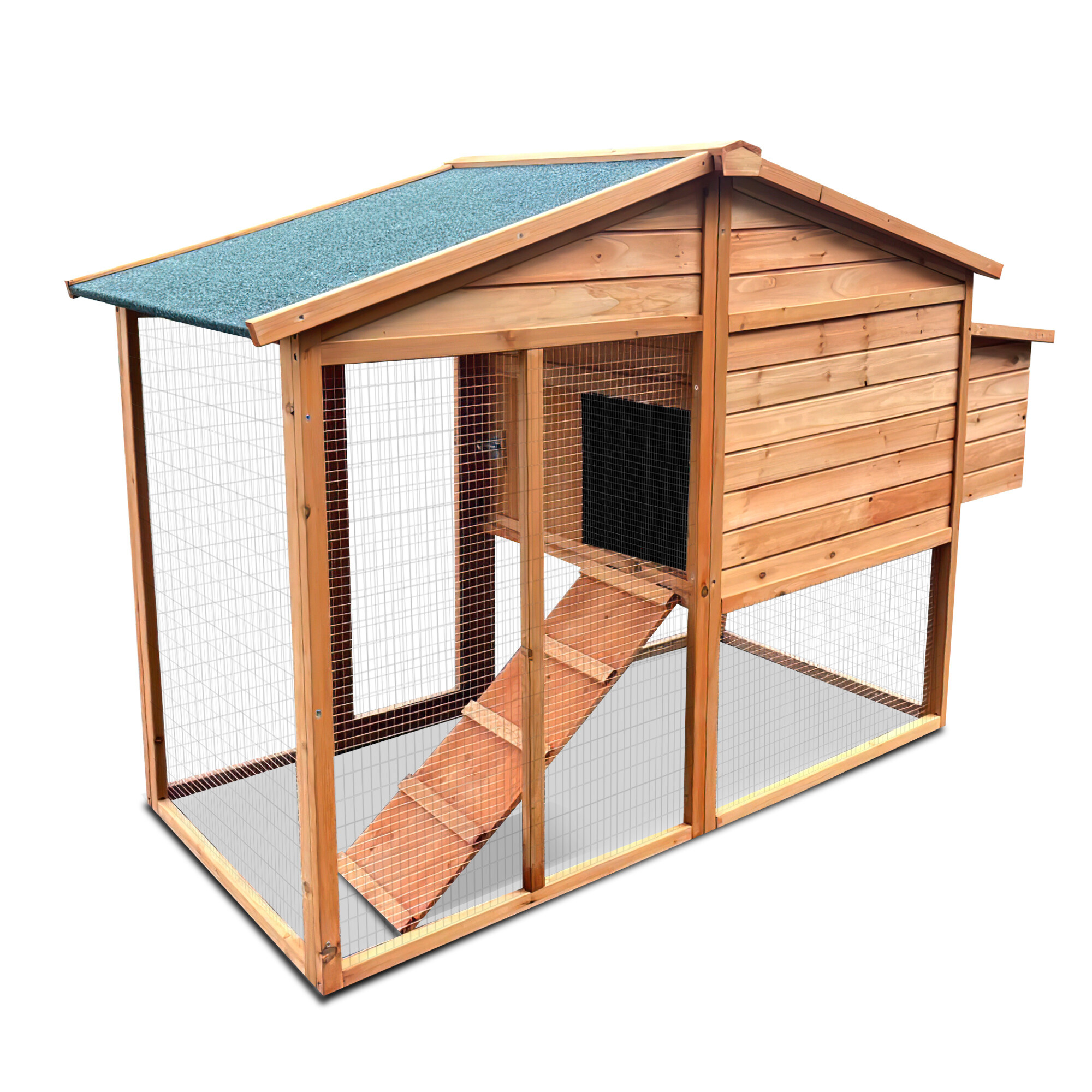 Výběh připojený k obytné části umožňuje slepicím volný pohyb. Střecha je osazena kvalitní šindelovou krytinou, která chrání slepice před deštěm a sněhem. Ze spodního do horního patra vede rampa, po níž mohou zvířata snadno vylézt nahoru. Dvířka lze jednoduše zavřít a zajistit zasouvacími západkami.