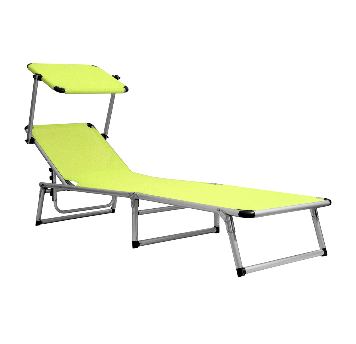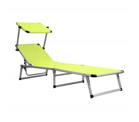 Skládací zahradní lehátko se stříškou a zpevněnou hliníkovou konstrukcí, v moderním designu, vhodné pro zahrady, na kempování či pláže.