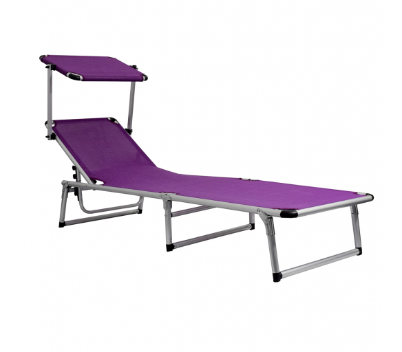 Skládací zahradní lehátko se stříškou a zpevněnou hliníkovou konstrukcí, v moderním designu, vhodné pro zahrady, na kempování či pláže.