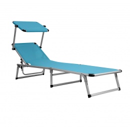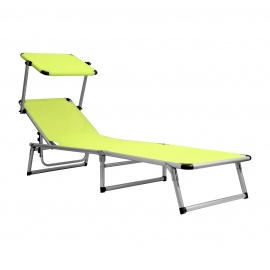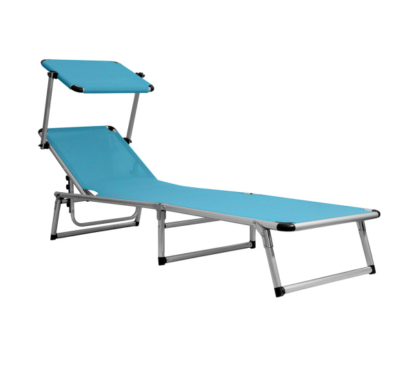 Skládací zahradní lehátko se stříškou a zpevněnou hliníkovou konstrukcí, v moderním designu, vhodné pro zahrady, na kempování či pláže.