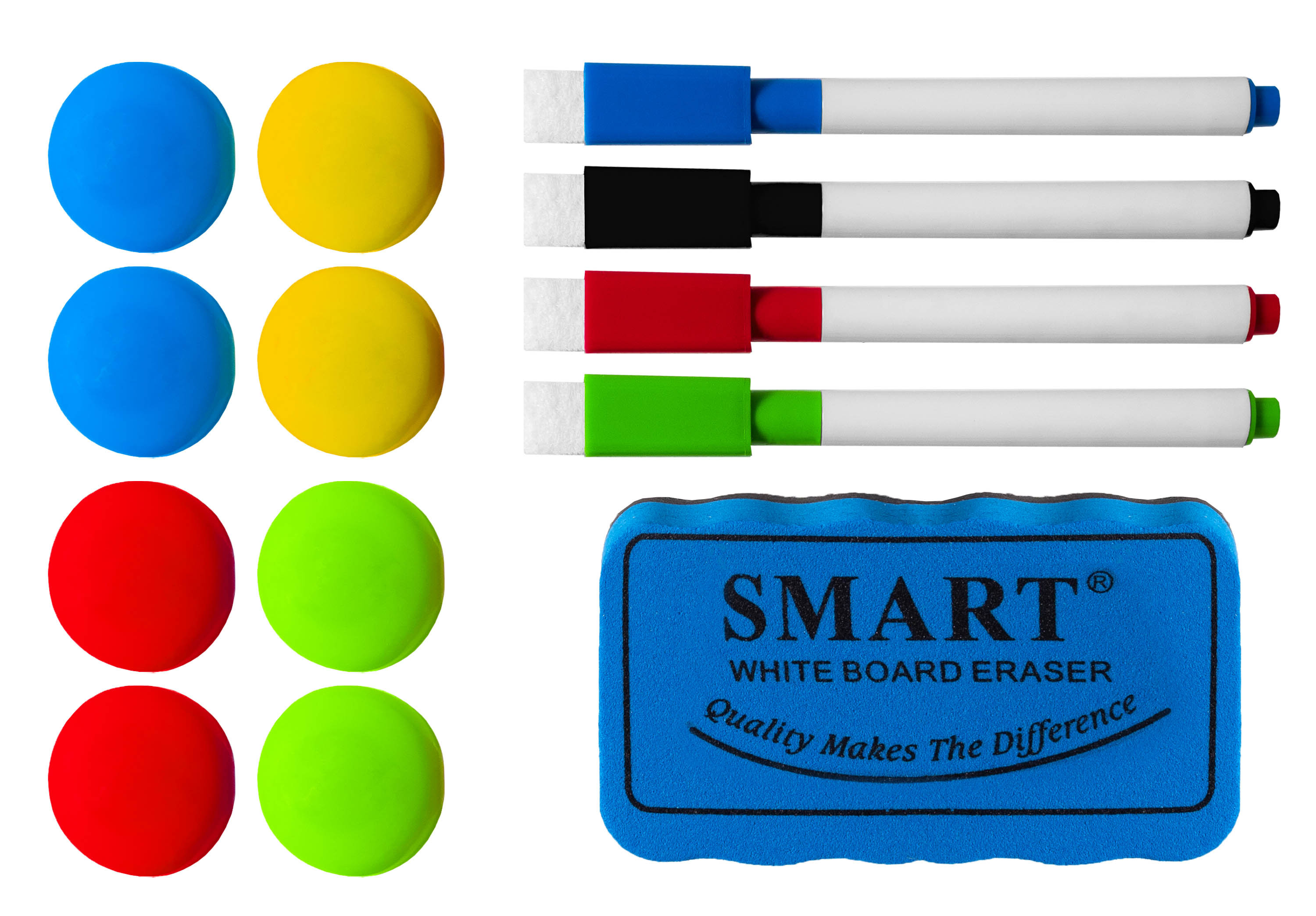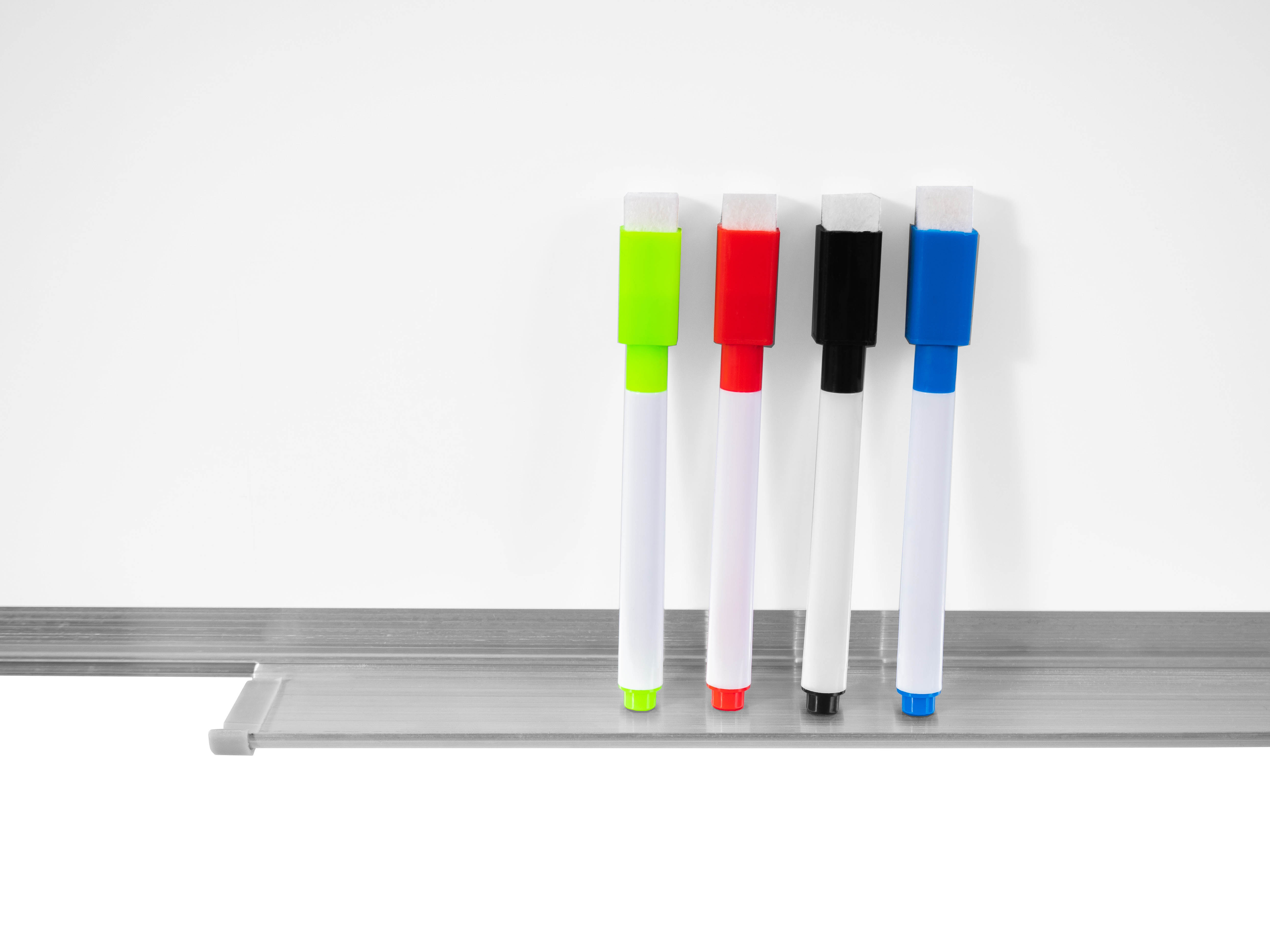 V balení najdete také 4 barevné popisovače, stírací houbička a 8 barevných magnetů.