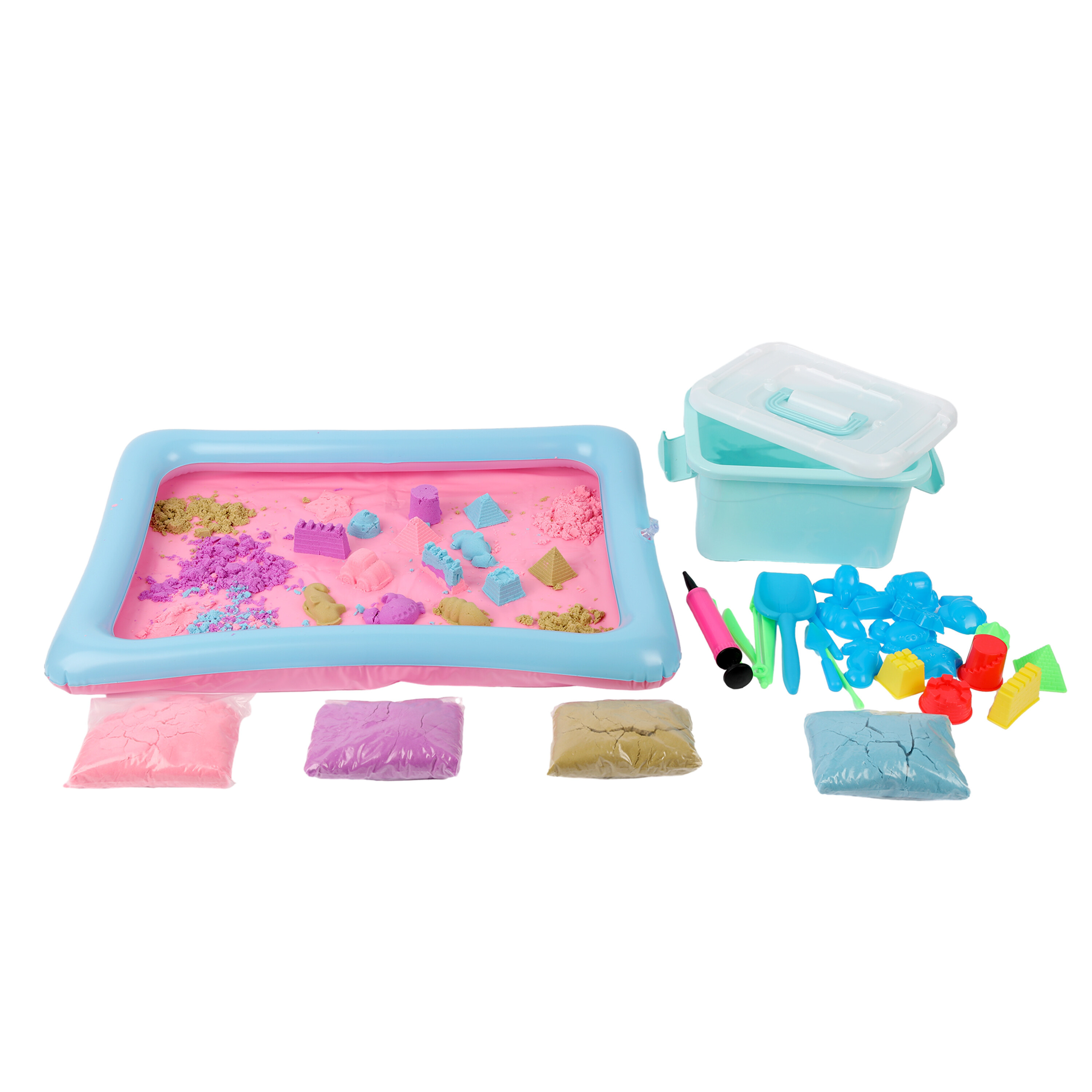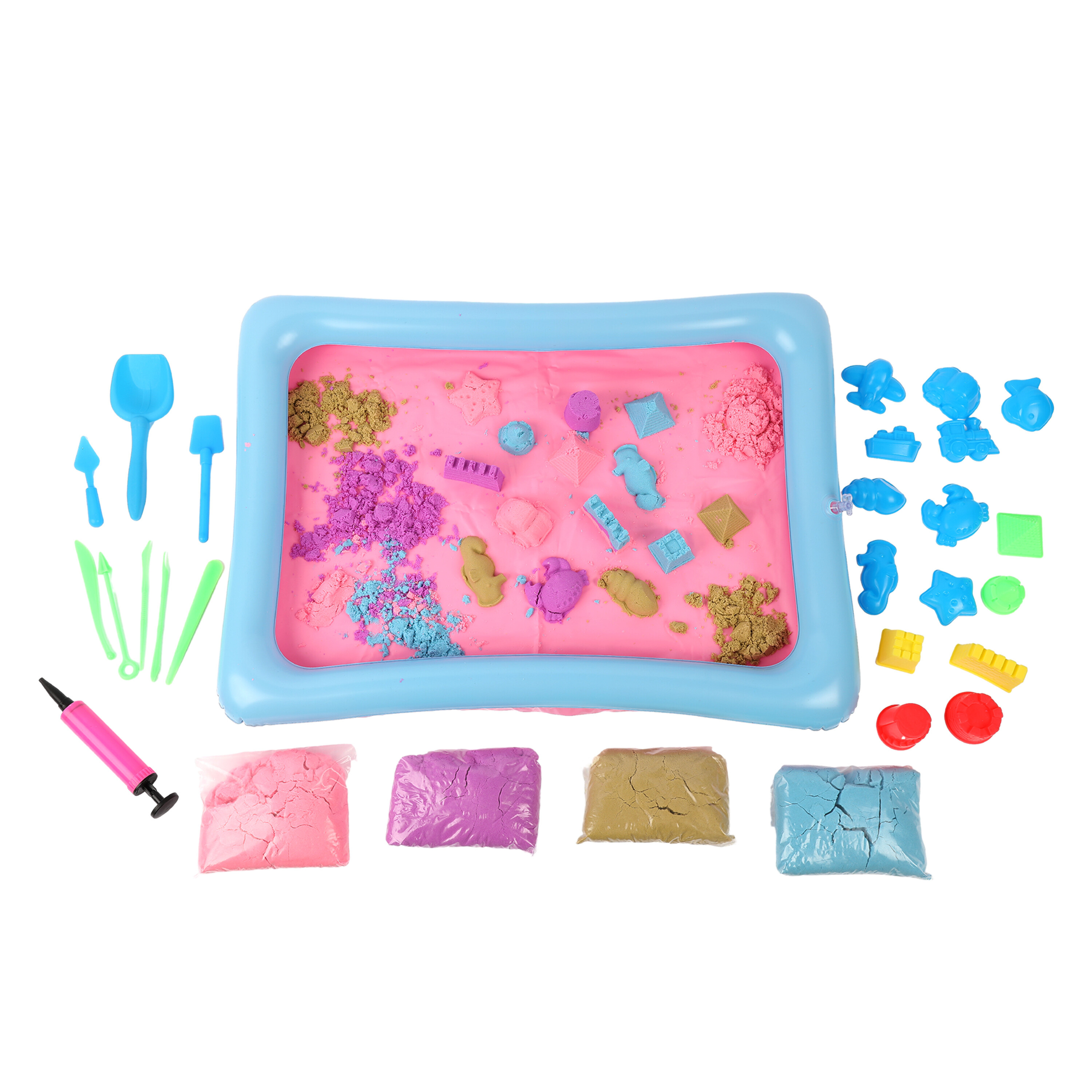 - Balení obsahuje nafukovací pískoviště, 15 formiček, 5 dlátek, lopatka, box, pumpičku a písek