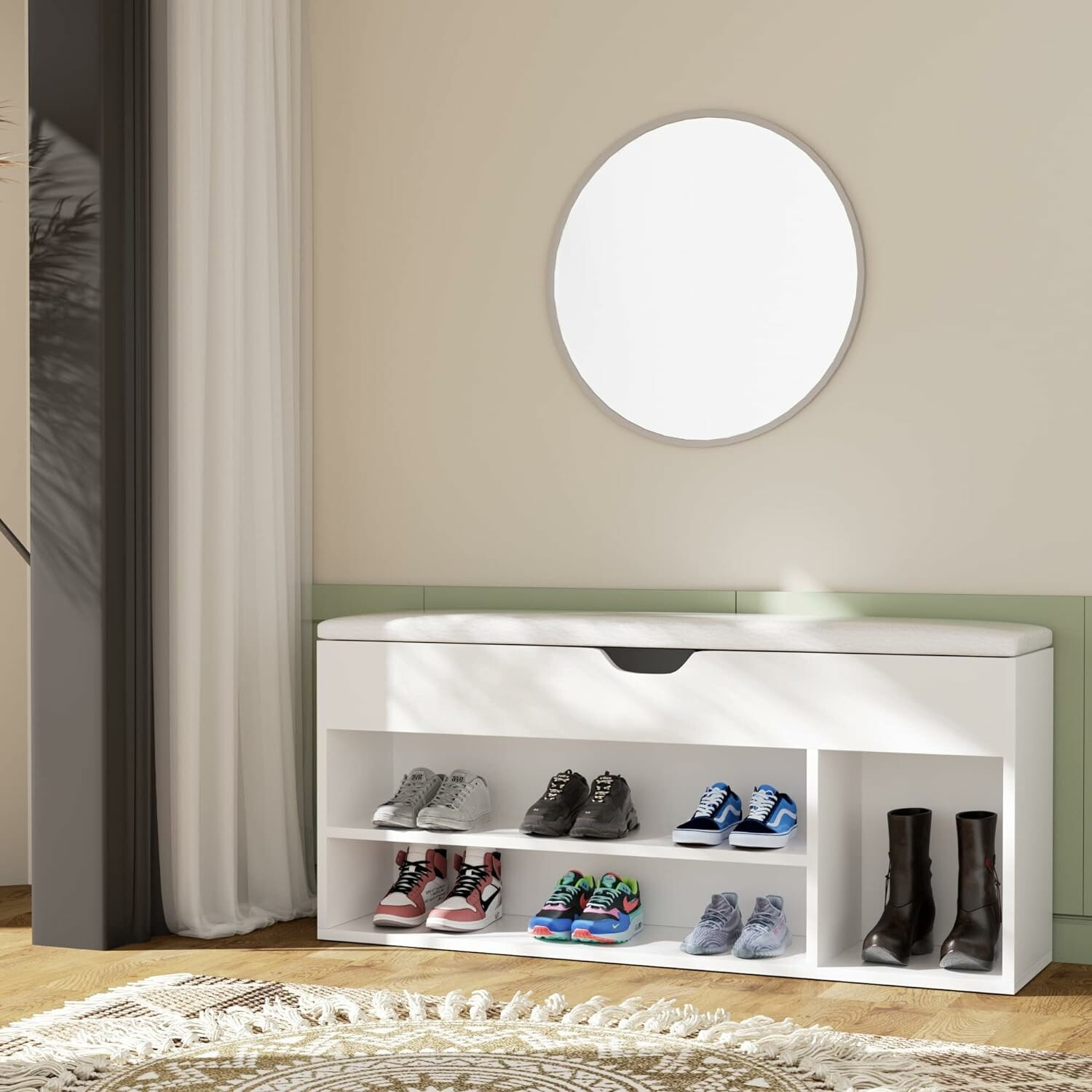 Prostorný botník s nosností sedadla až 80 kg. Botník je vyroben z kvalitních materiálů, které zajišťují jeho pevnost a odolnost, a zároveň je snadno čistitelný.