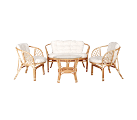 Kolekce obsahuje 4 ratanová křesla a ratanový stolek se skleněnou deskou. Stolek má ve spodní části plochu na ukládání drobných věcí.