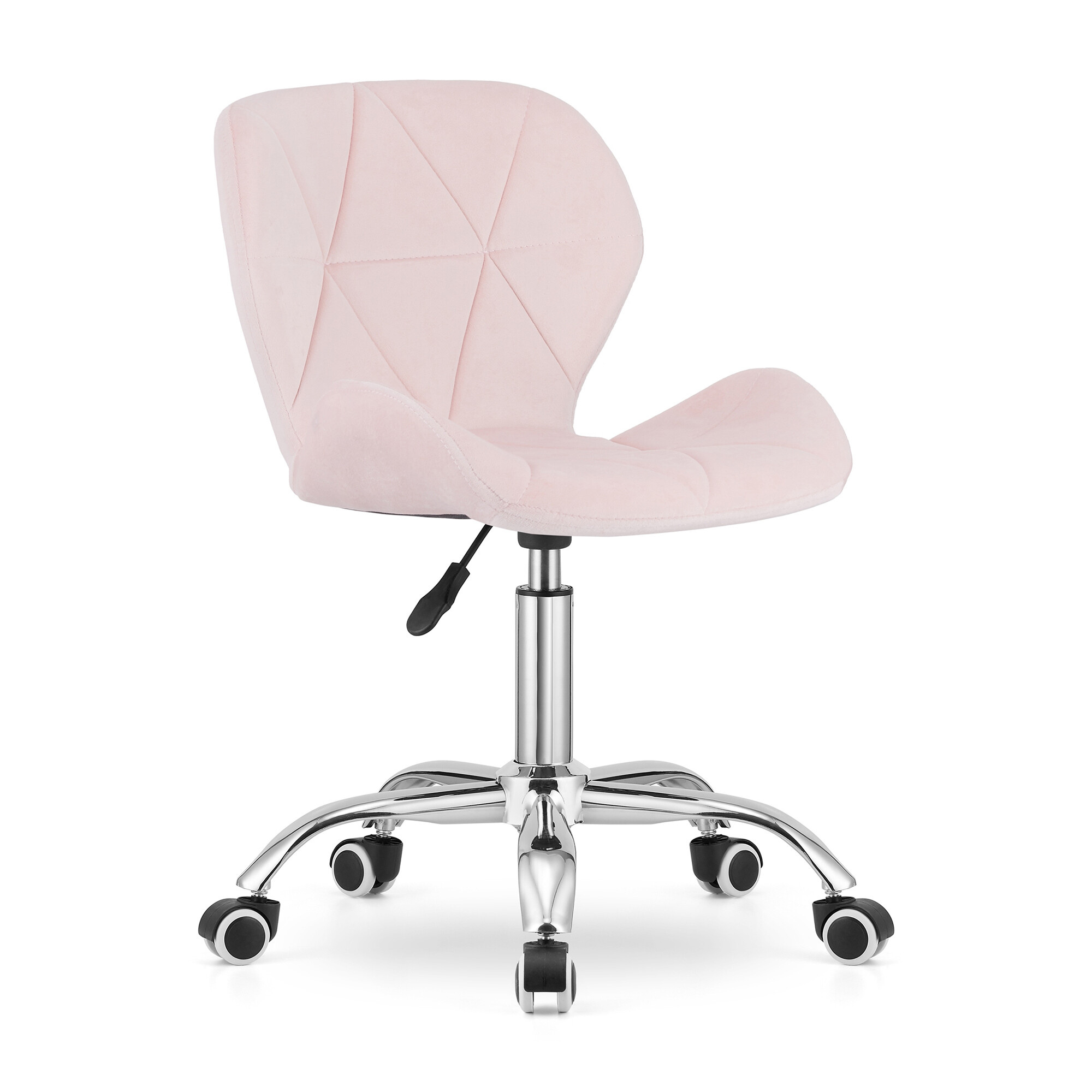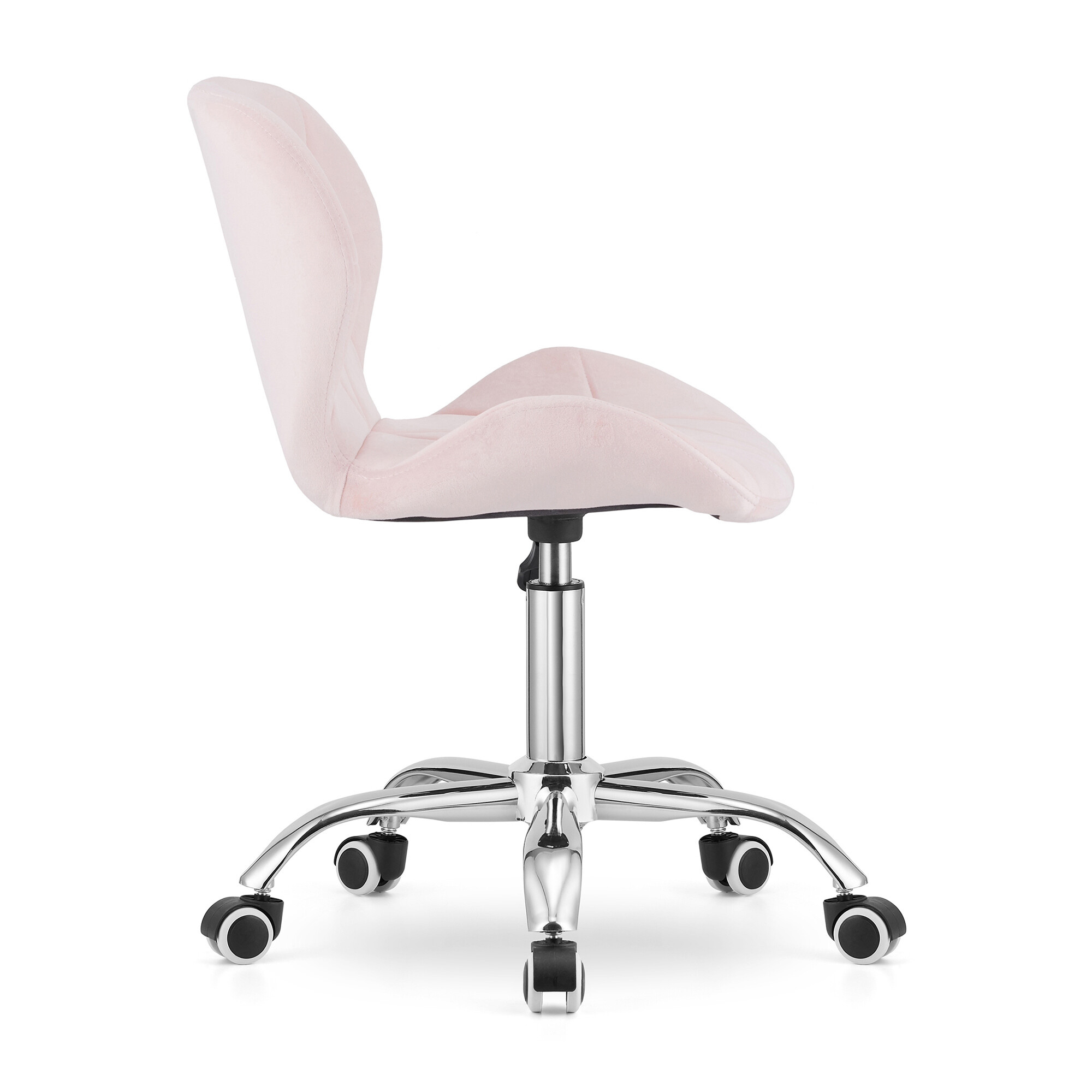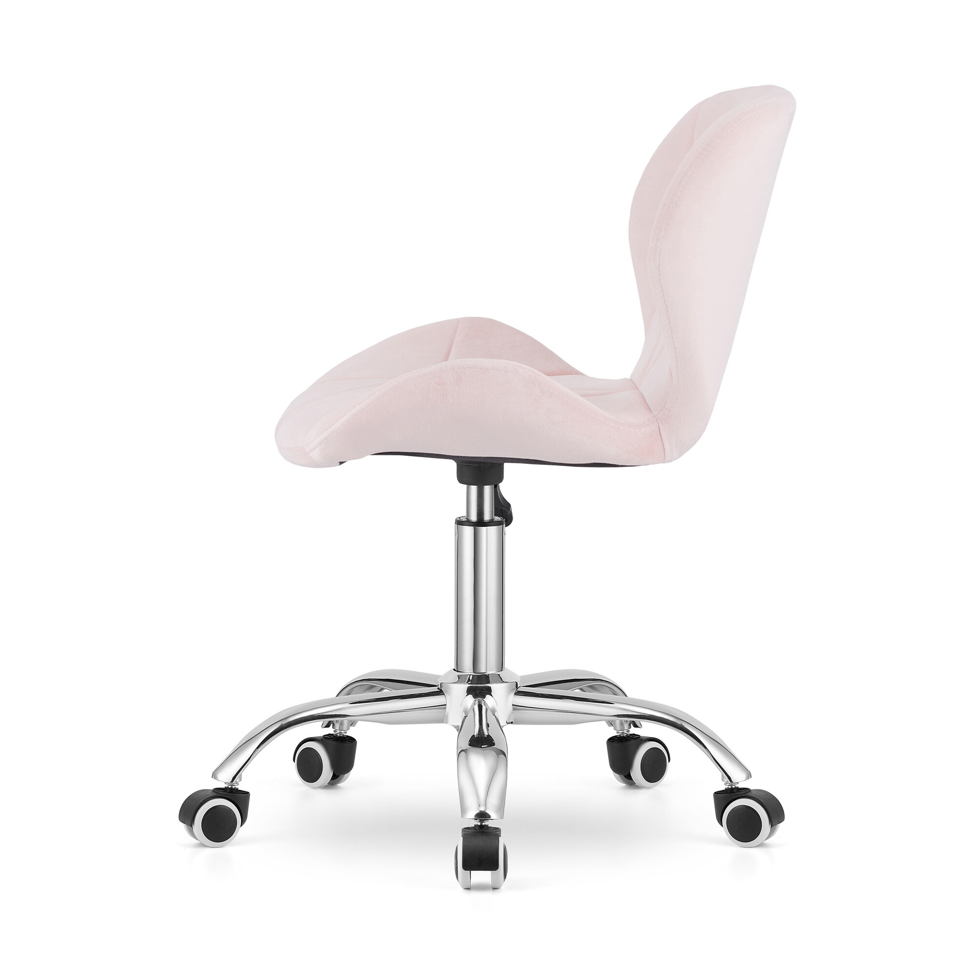 Pětiramenná chromovaná podnož s gumovými kolečky zajišťuje stabilitu a plynulý pohyb po různých površích.