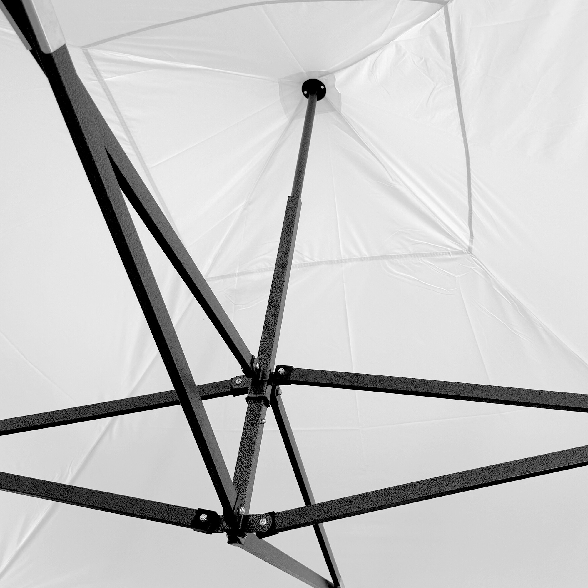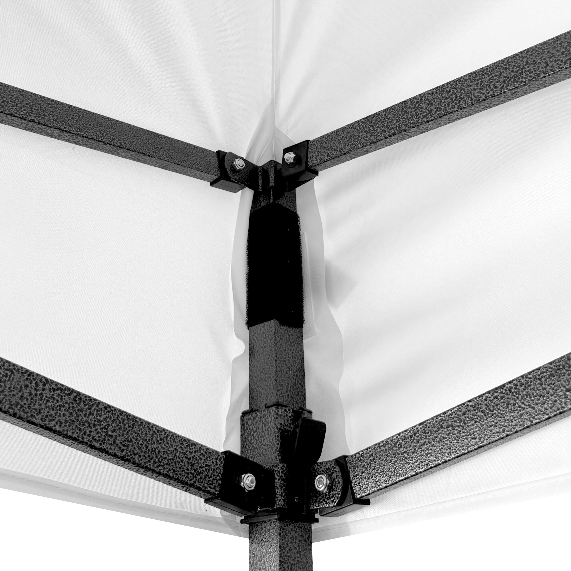 Konstrukci tvoří ocelový rám s nůžkovým mechanismem, který je povrchově chráněn práškovým lakem proti korozi. Oproti běžným skládacím stanům má tento model šroubované spoje, což zvyšuje pevnost, prodlužuje životnost a usnadňuje případný servis nebo výměnu dílů. Díky třem stupňům regulace lze výšku nastavit od 213 cm až do 290 cm, takže stánek snadno přizpůsobíte konkrétním podmínkám.