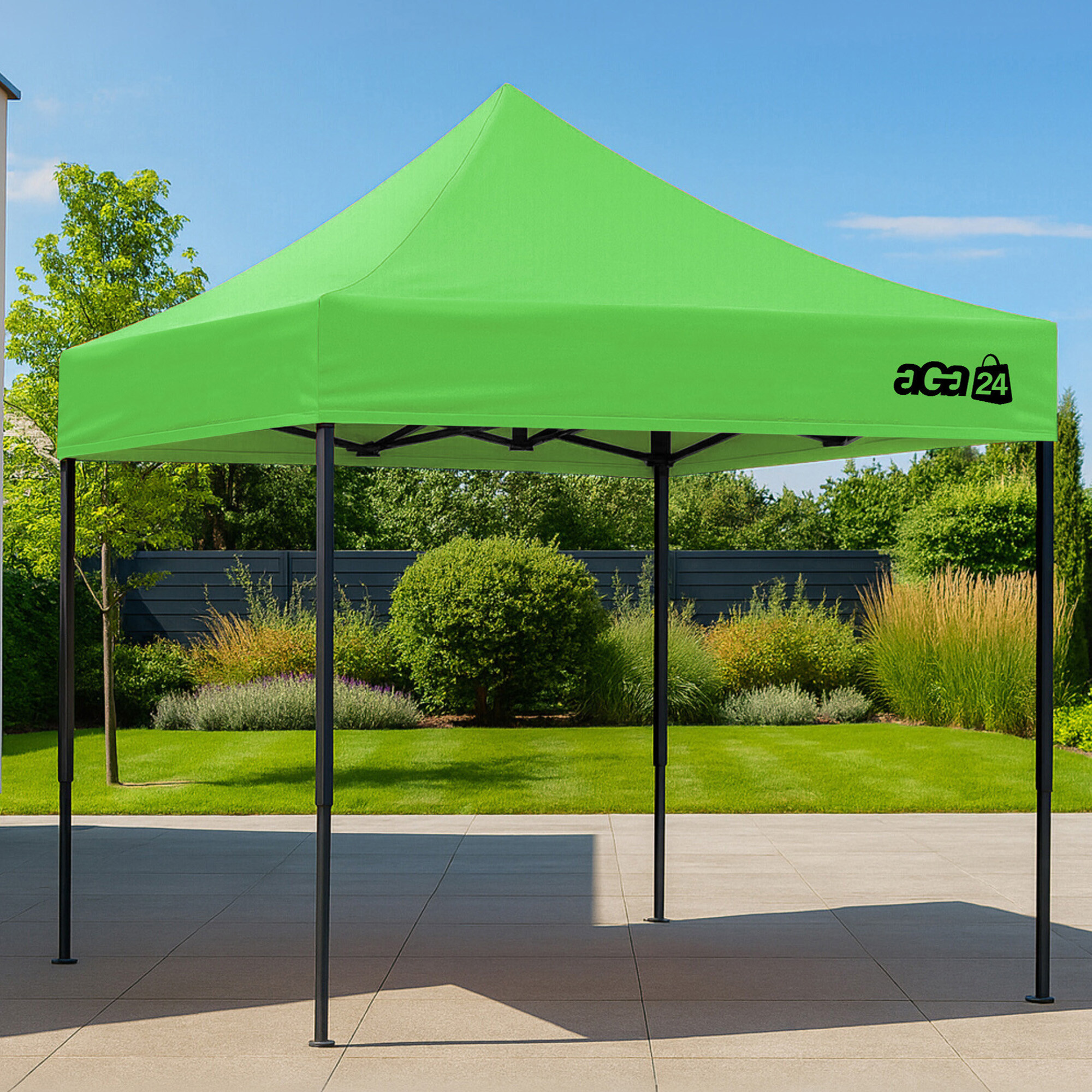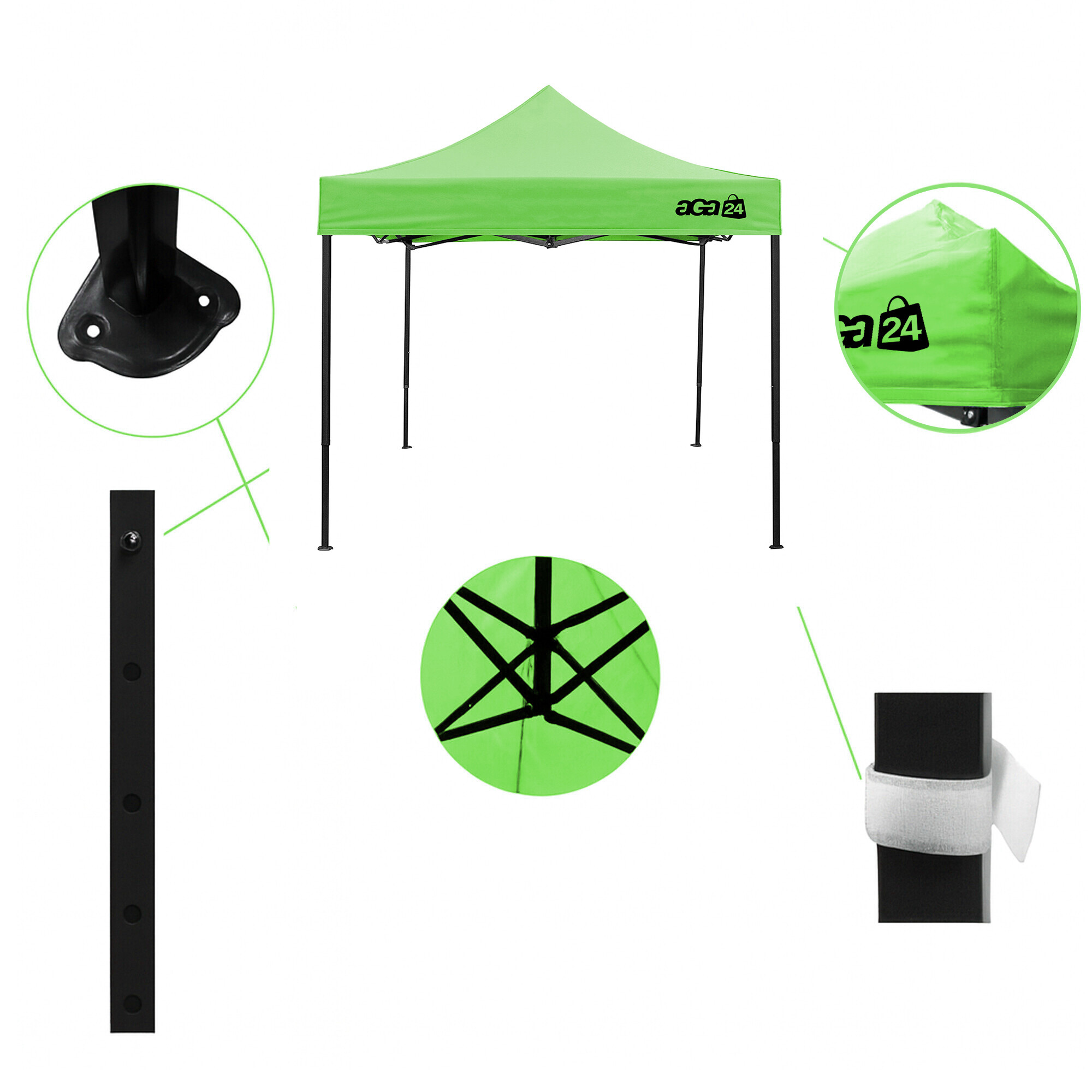 Konstrukci tvoří ocelový rám s nůžkovým mechanismem, který je povrchově chráněn práškovým lakem proti korozi. Oproti běžným skládacím stanům má tento model šroubované spoje, což zvyšuje pevnost, prodlužuje životnost a usnadňuje případný servis nebo výměnu dílů. Díky třem stupňům regulace lze výšku nastavit od 213 cm až do 290 cm, takže stánek snadno přizpůsobíte konkrétním podmínkám.