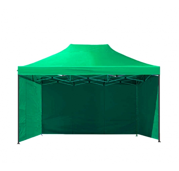Prodejní stánek s lehkou rychleskládající se nůžkovou konstrukcí, vybavený třemi postranními odnímatelnými panely, připevněnými suchým zipem a třístupňovou možností regulaci jeho výšky.