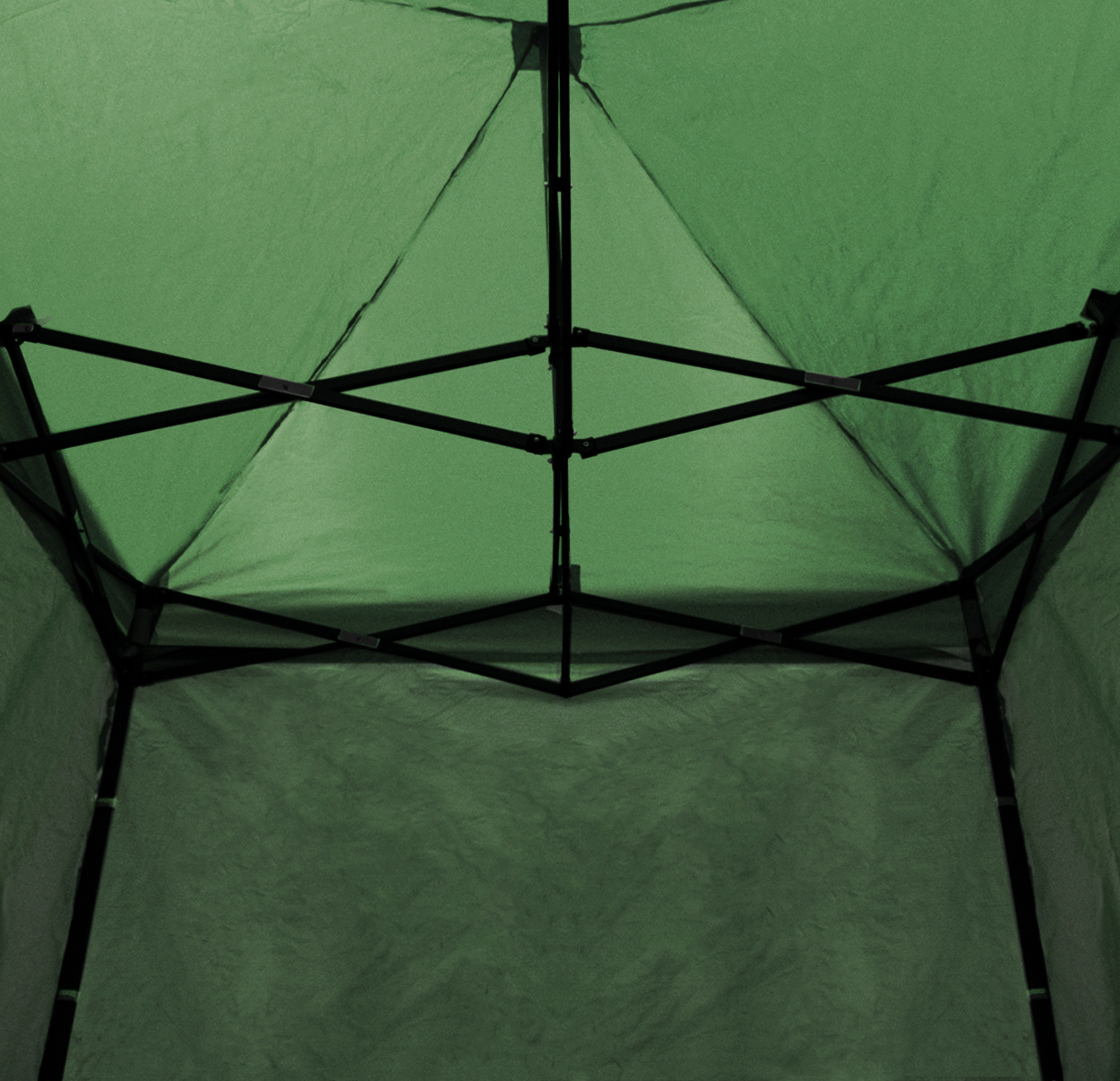 Střecha z 420D PU Oxfordu a bočnice z PVC Oxford 210D poskytují ochranu před větrem i deštěm a zároveň vytvářejí reprezentativní zázemí pro prodejce i zákazníky. Díky praktickému suchému zipu lze bočnice rychle sejmout nebo znovu upevnit.