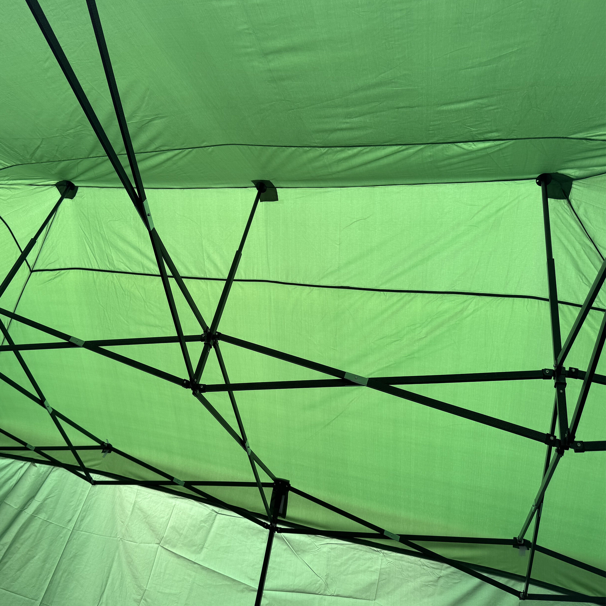 Střecha z 420D PU Oxfordu chrání před deštěm i sluncem, zatímco bočnice z PVC Oxford 210D vytvářejí kryté a reprezentativní prostředí pro vystavovatele i návštěvníky. Bočnice lze snadno připevnit nebo sejmout díky suchým zipům, takže stánek rychle přizpůsobíte aktuálním podmínkám.