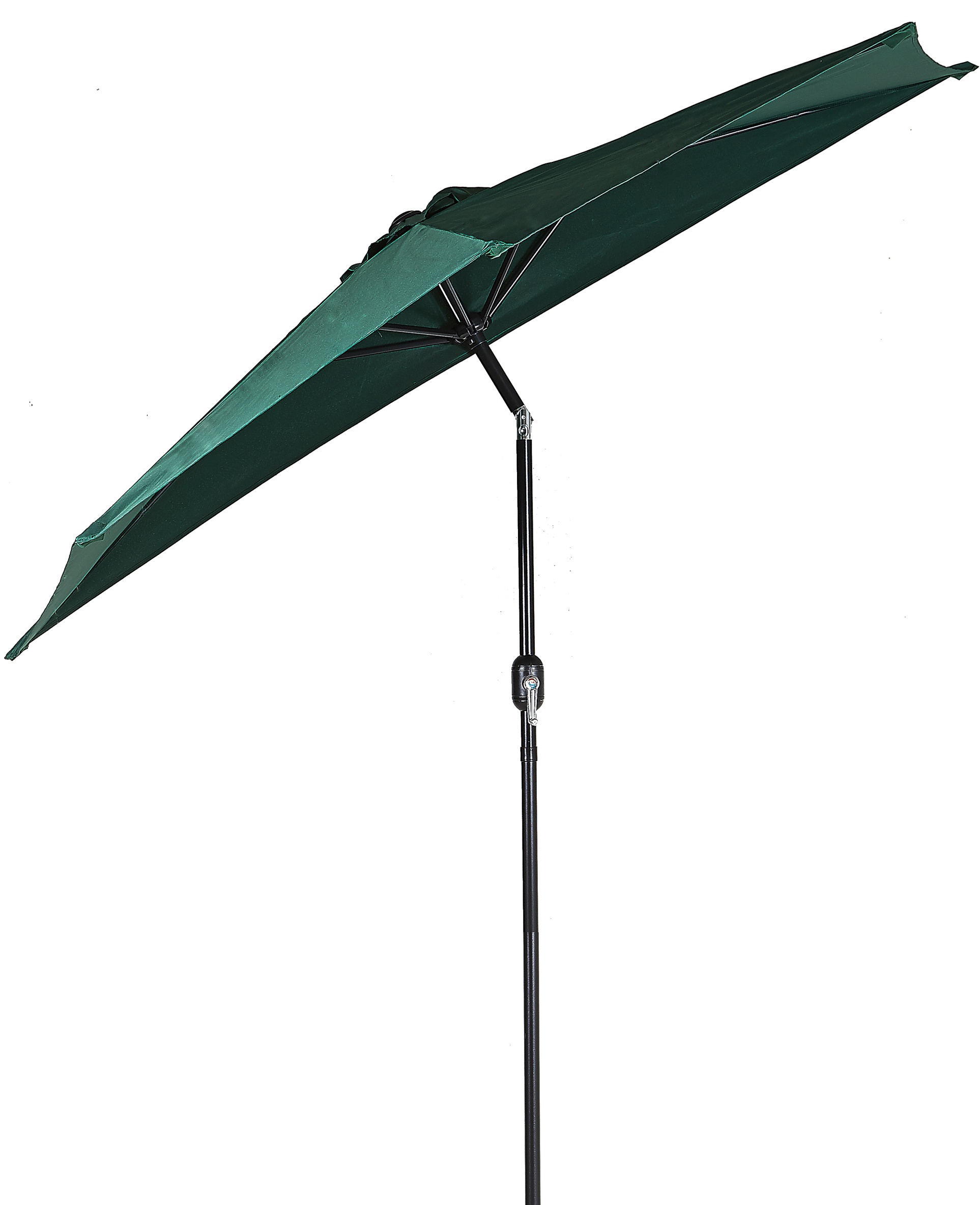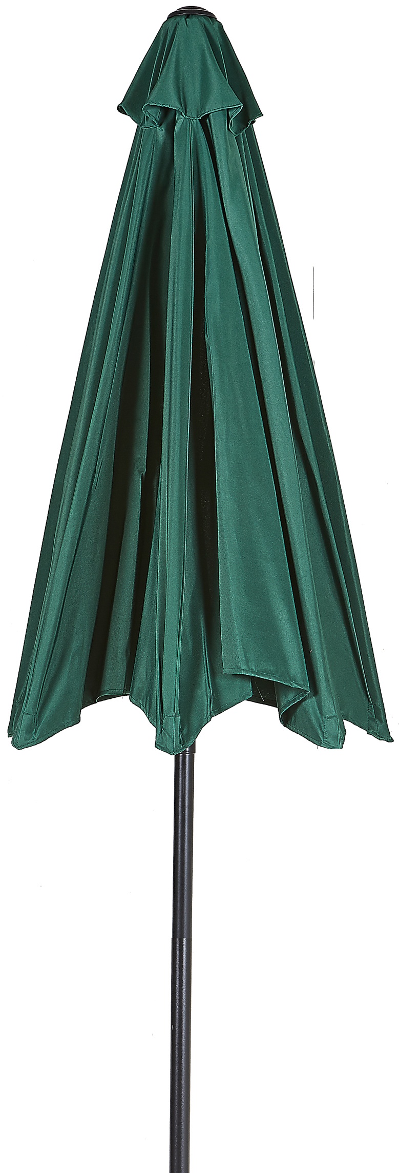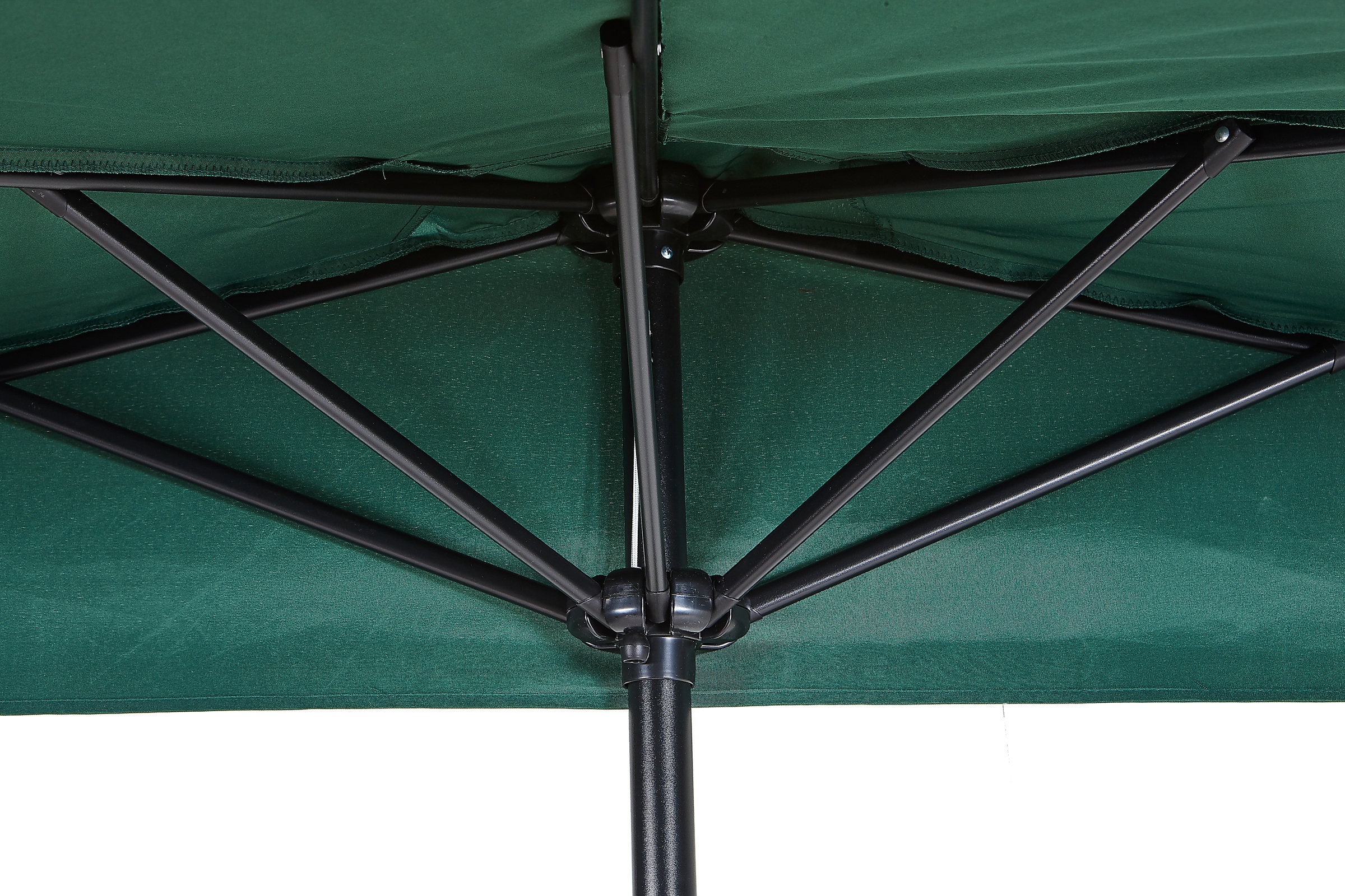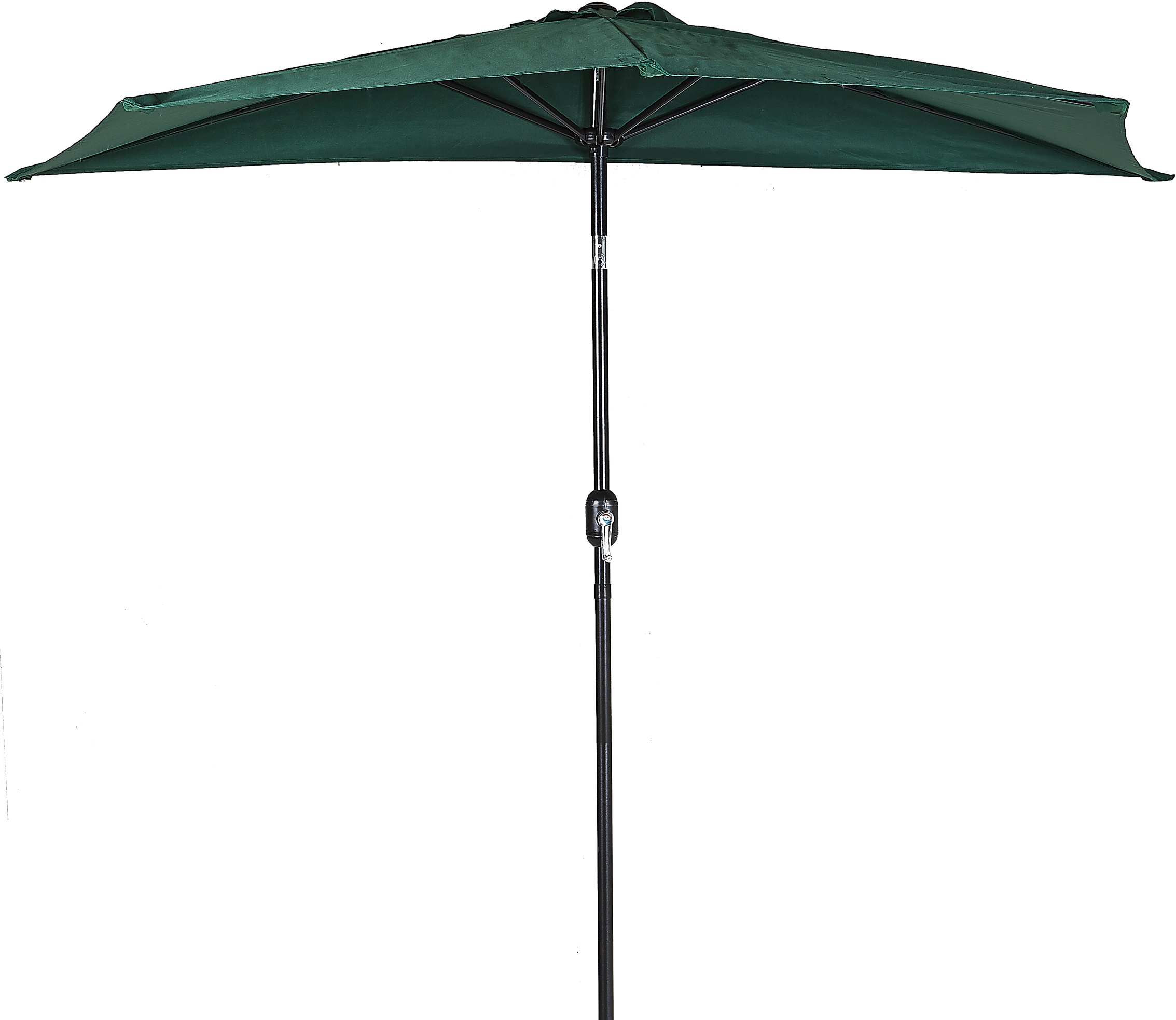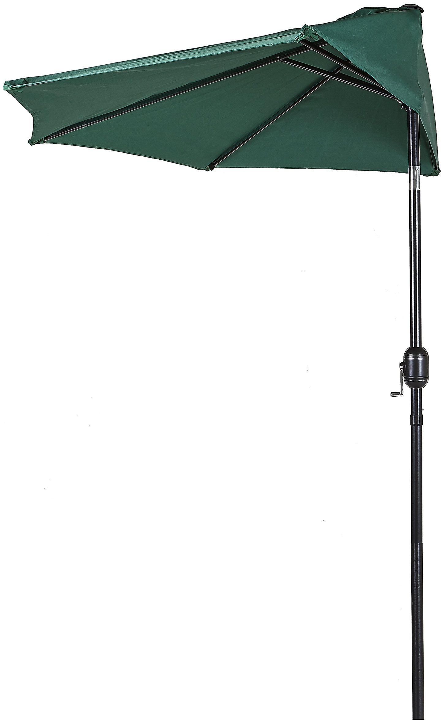 Půlkruhový zahradní slunečník s pevnou konstrukcí a kvalitním potahem, vyrobeným z odolného polyesterového materiálu.