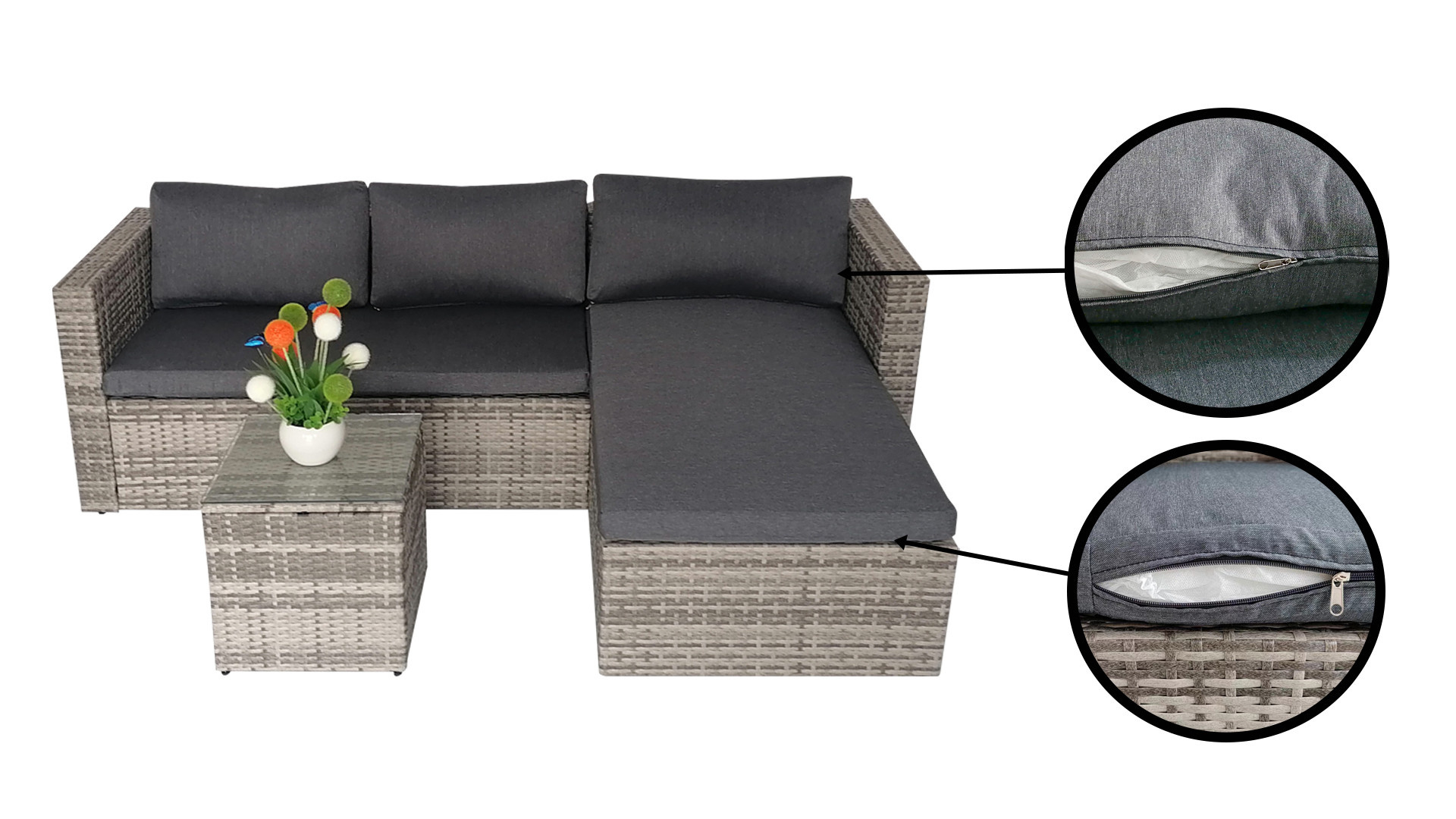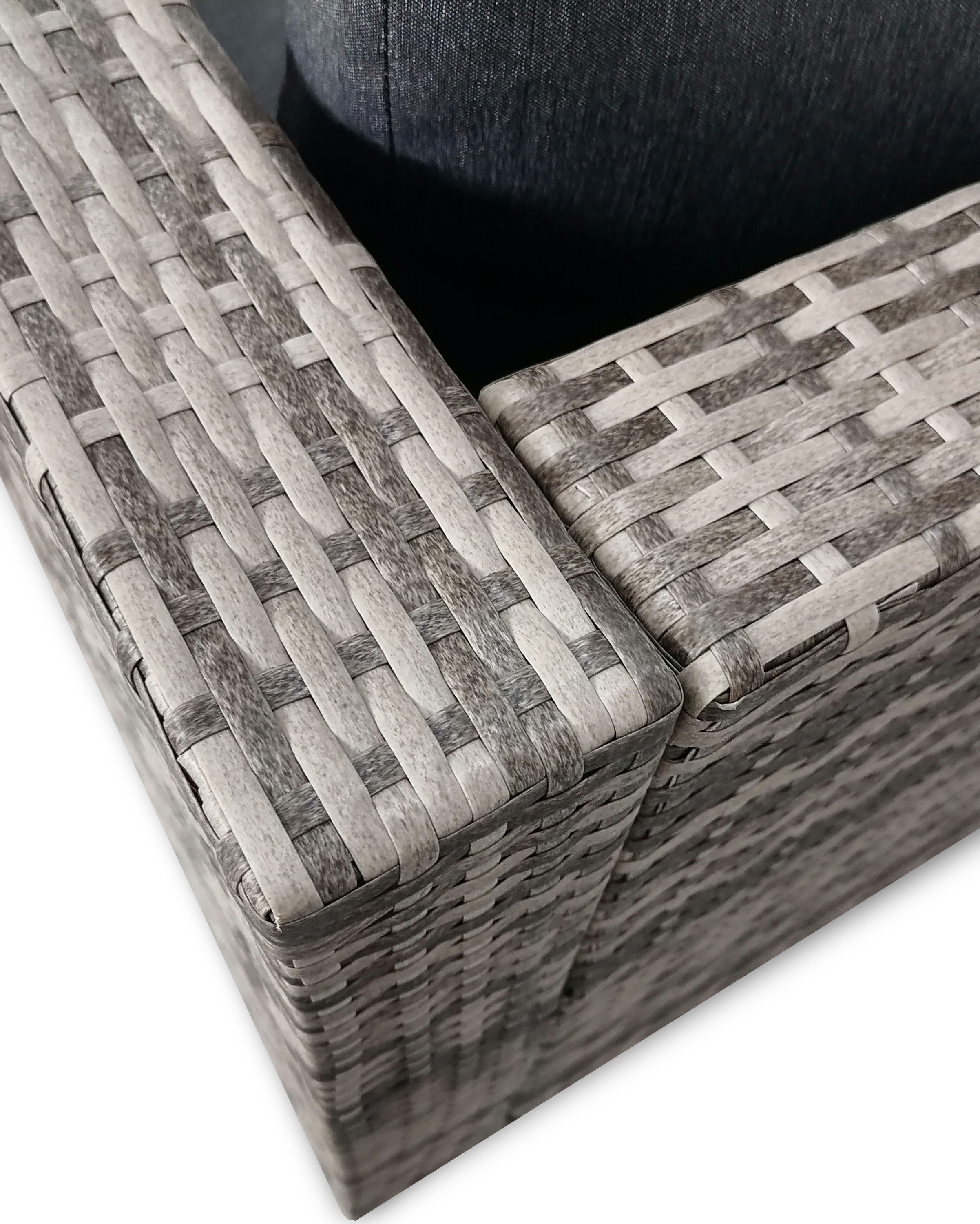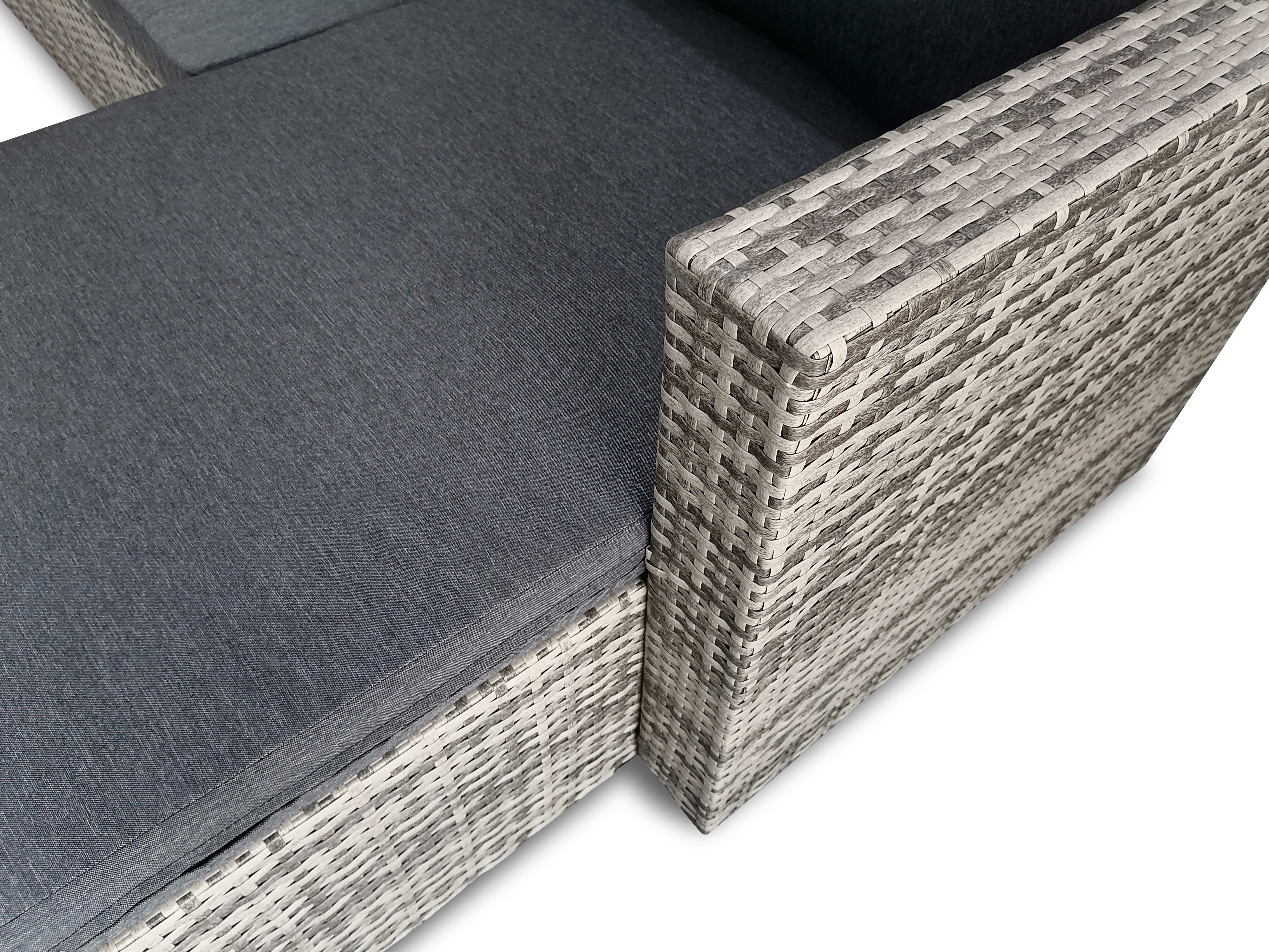 Tato krásná polyratanová sestava se skládá z dlouhé dvoumístné pohovky, rohové pohovky a čtvercového stolu. Sedáky a opěrné polštáře o tloušťce 8 cm s tmavě šedými návleky poskytují úžasně měkký pocit při sezení.