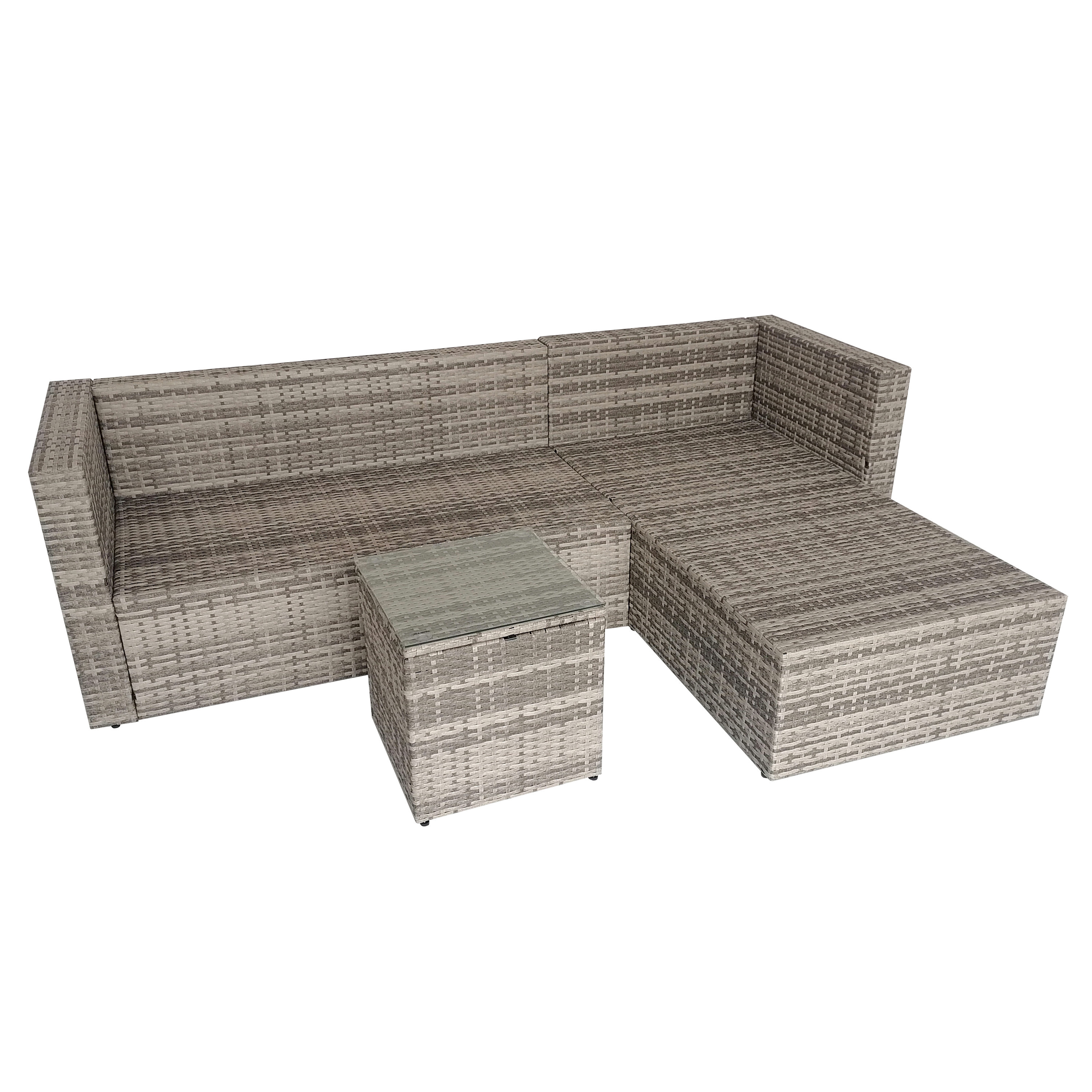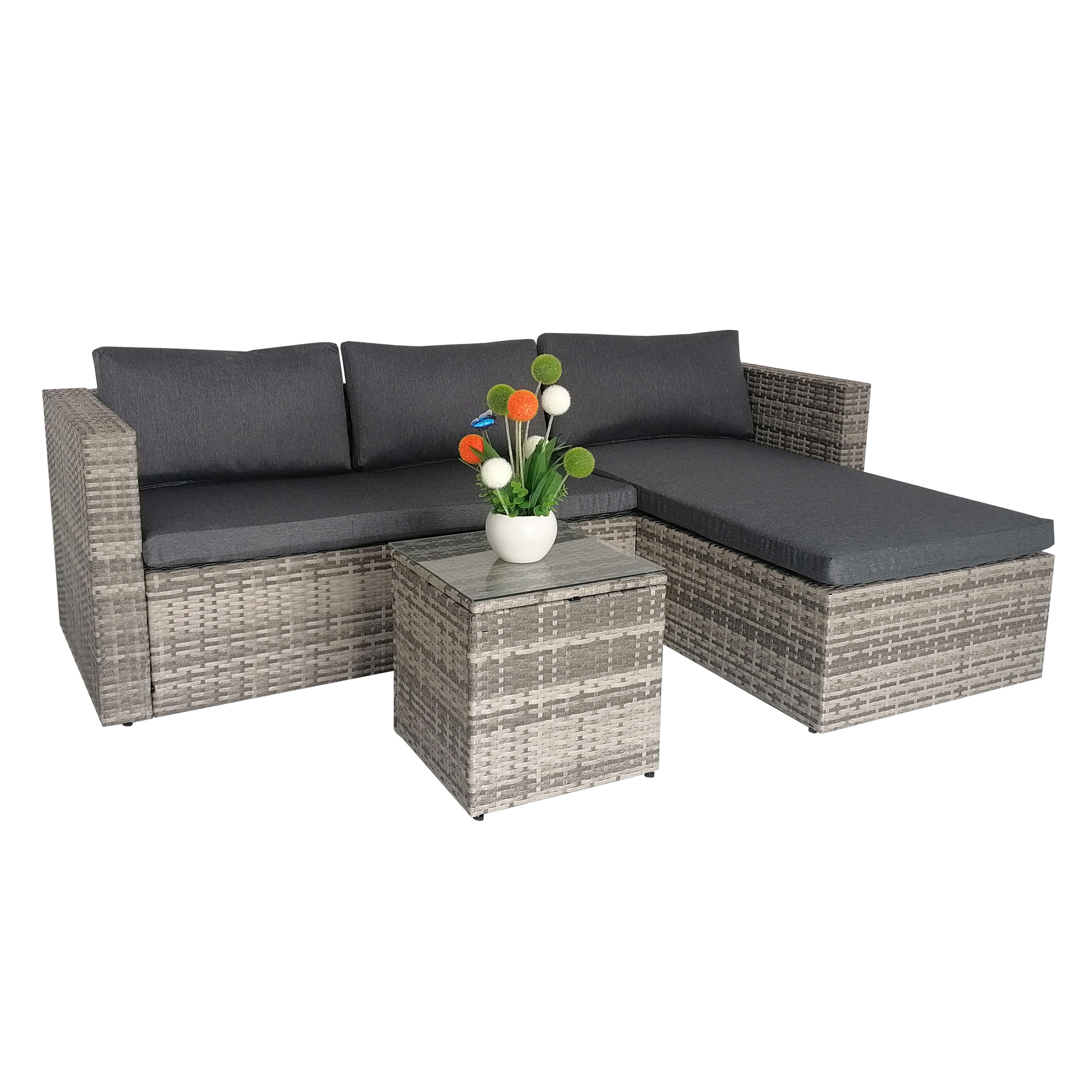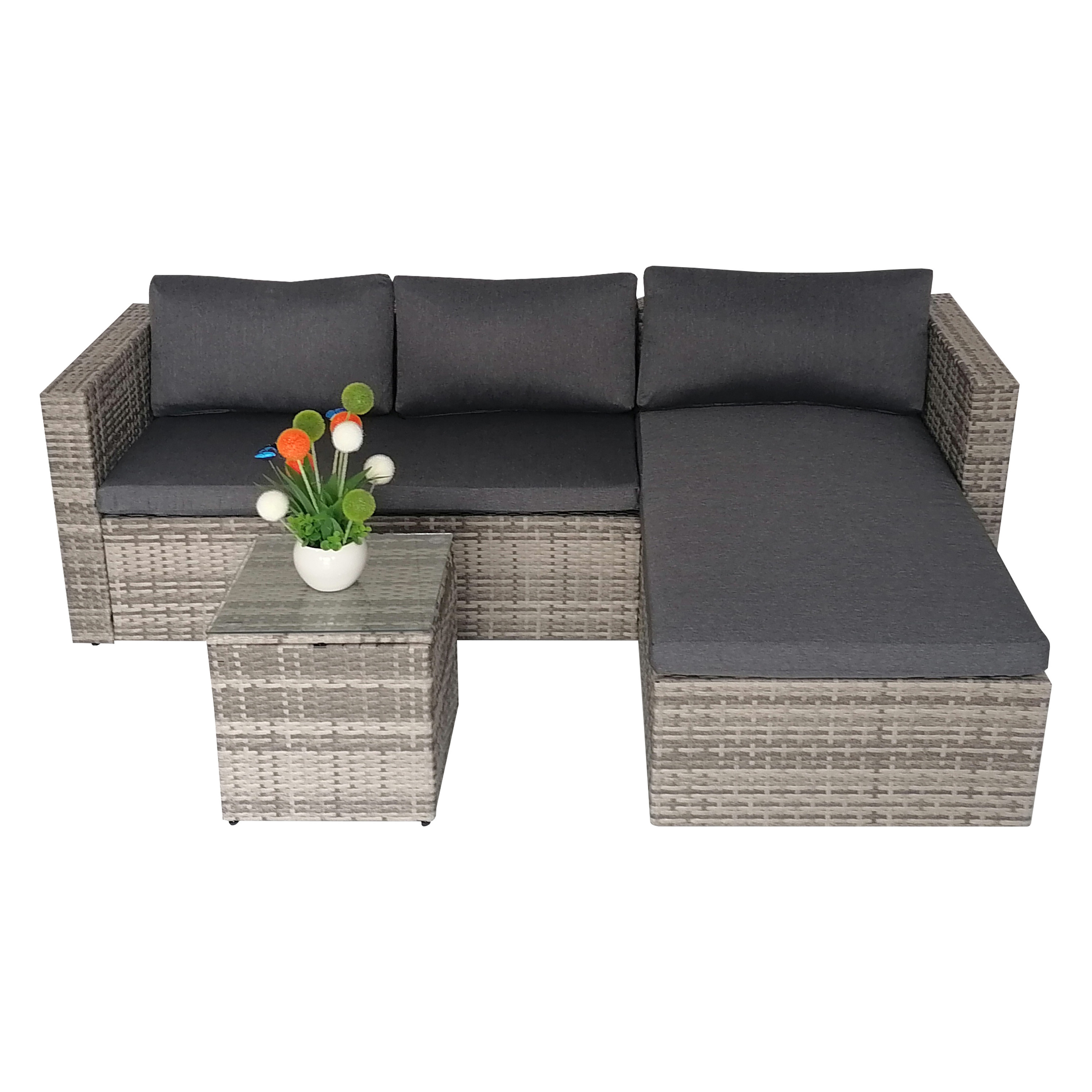 Tato krásná polyratanová sestava se skládá z dlouhé dvoumístné pohovky, rohové pohovky a čtvercového stolu. Sedáky a opěrné polštáře o tloušťce 8 cm s tmavě šedými návleky poskytují úžasně měkký pocit při sezení.