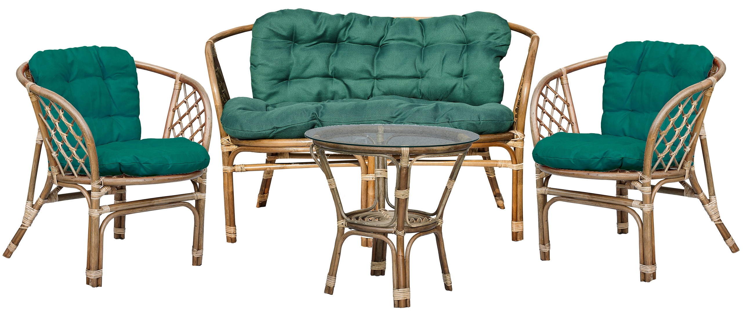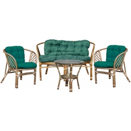 Kolekce obsahuje 2 ratanová křesla, ratanovou lavici a ratanový stolek se skleněnou deskou. Stolek má ve spodní části plochu na ukládání drobných věcí.