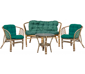 • Sestava obsahuje: Ratanovou lavici, 2 křesla, stolek se sklem a kompletní sadu polstrů