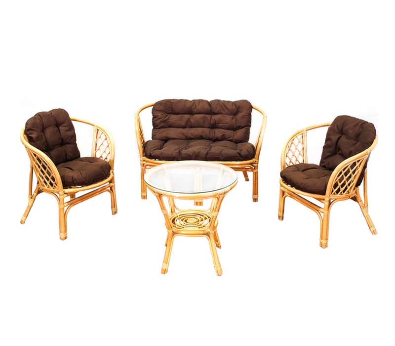 Kolekce obsahuje 2 ratanová křesla, ratanovou lavici a ratanový stolek se skleněnou deskou. Stolek má ve spodní části plochu na ukládání drobných věcí.