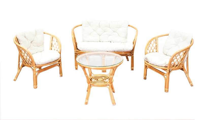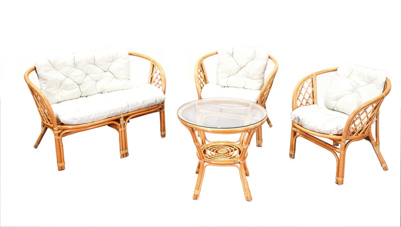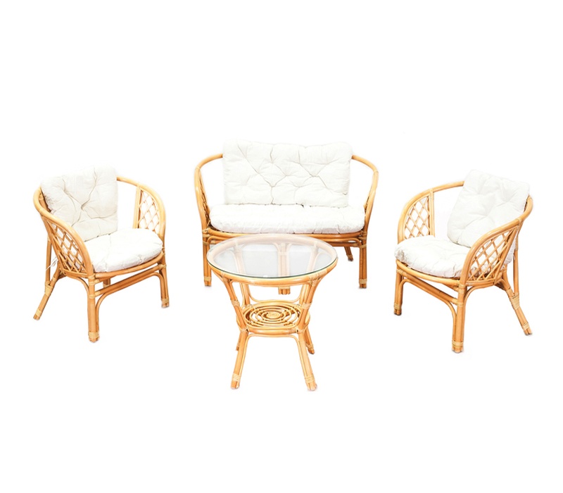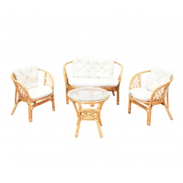Kolekce obsahuje 2 ratanová křesla, ratanovou lavici a ratanový stolek se skleněnou deskou. Stolek má ve spodní části plochu na ukládání drobných věcí.