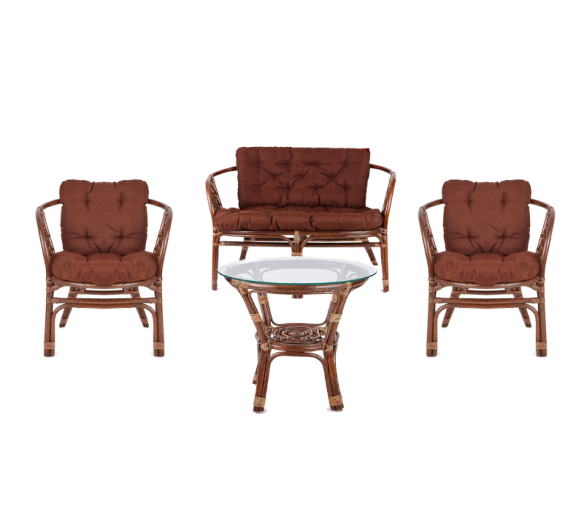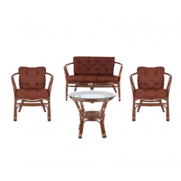 Kolekce obsahuje 2 ratanová křesla, ratanovou lavici a ratanový stolek se skleněnou deskou. Stolek má ve spodní části plochu na ukládání drobných věcí.