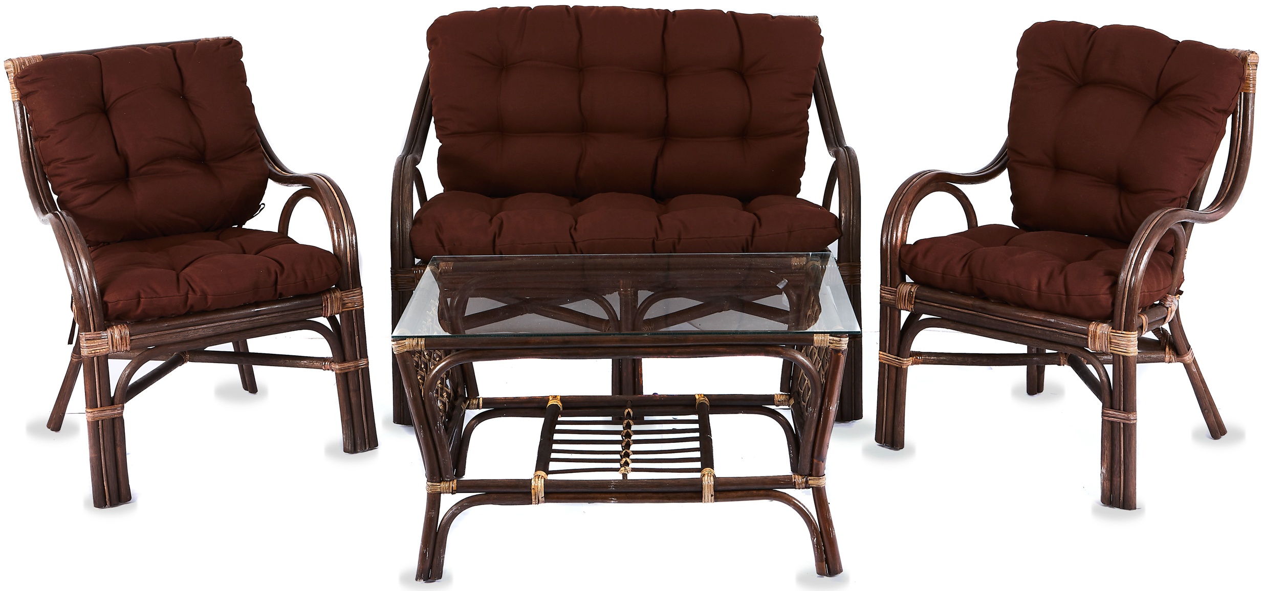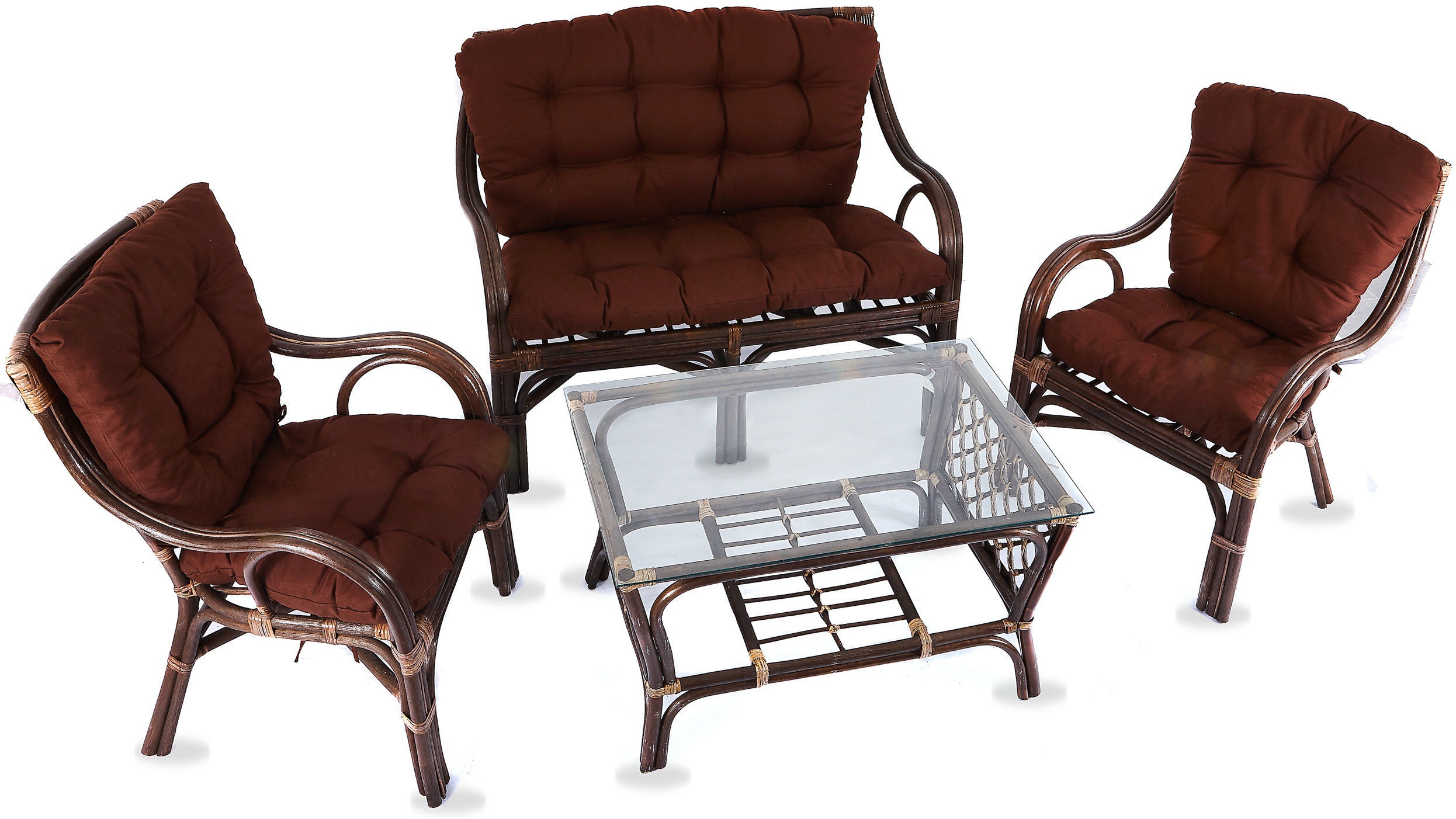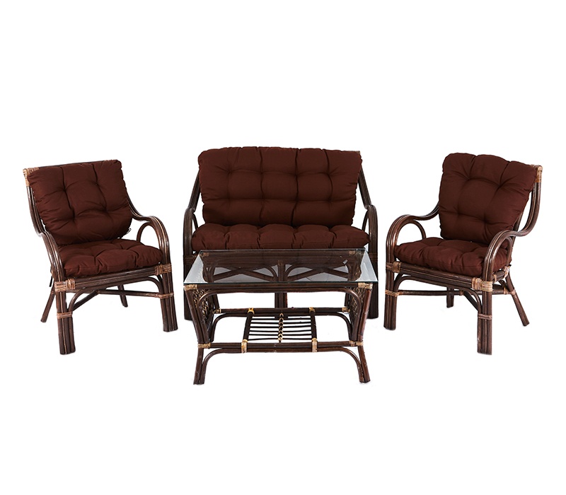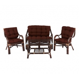 Kolekce obsahuje 2 ratanová křesla, ratanovou lavici a ratanový stolek se skleněnou deskou. Stolek má ve spodní části plochu na ukládání drobných věcí.