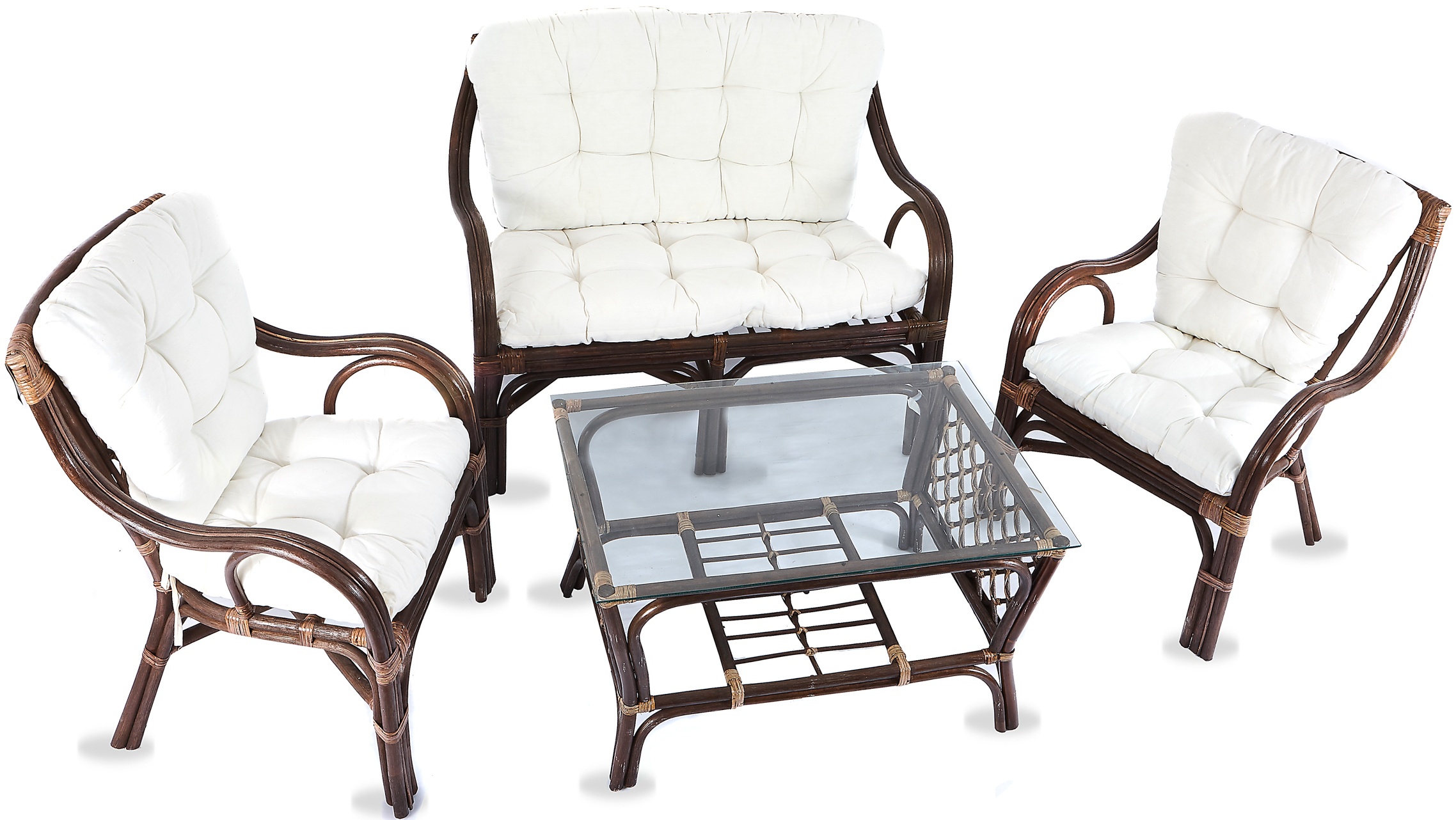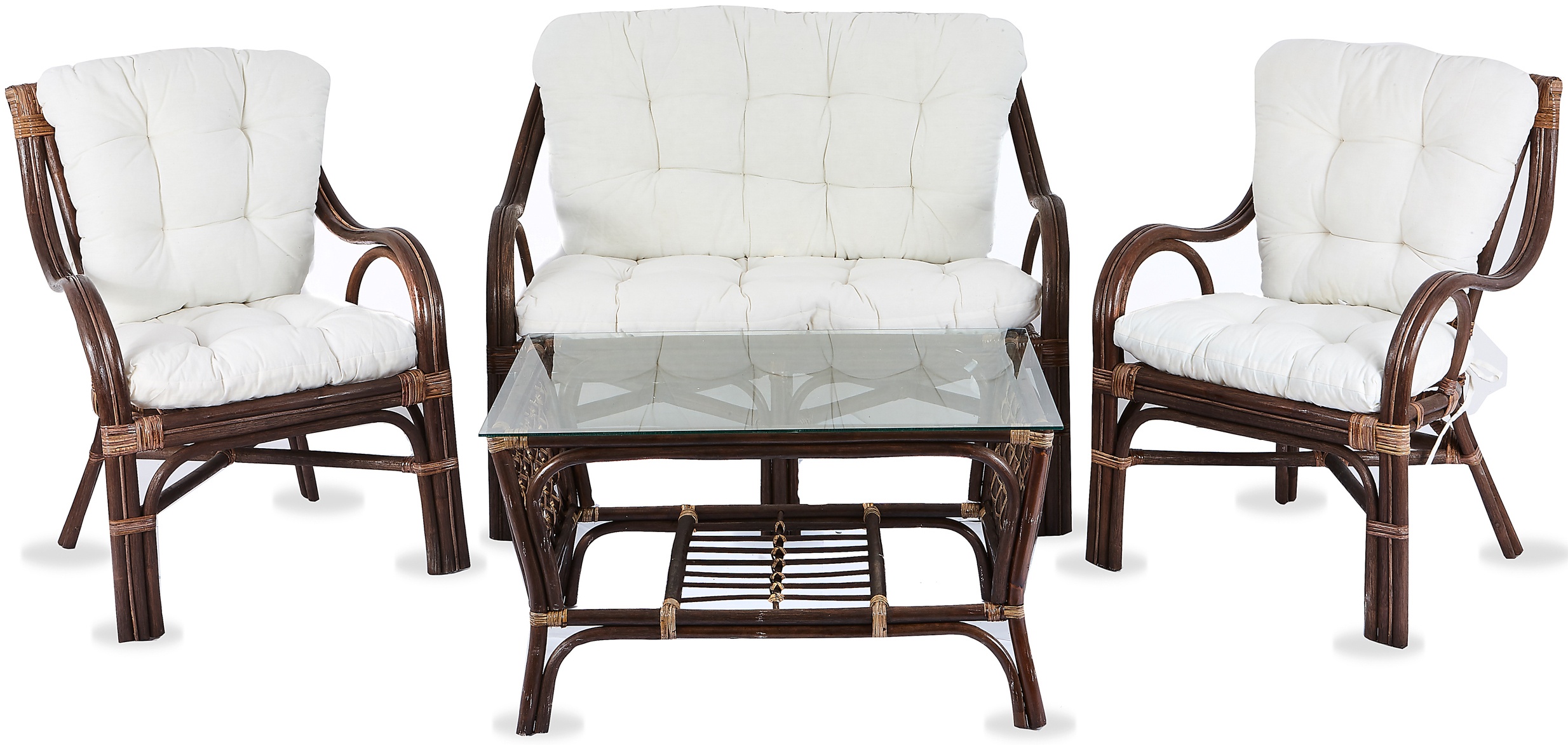 Kolekce obsahuje 2 ratanová křesla, ratanovou lavici a ratanový stolek se skleněnou deskou. Stolek má ve spodní části plochu na ukládání drobných věcí.