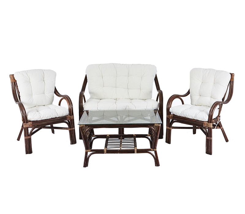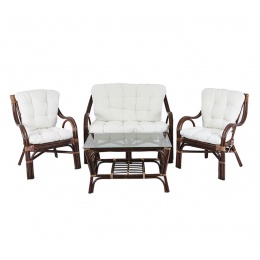 Kolekce obsahuje 2 ratanová křesla, ratanovou lavici a ratanový stolek se skleněnou deskou. Stolek má ve spodní části plochu na ukládání drobných věcí.