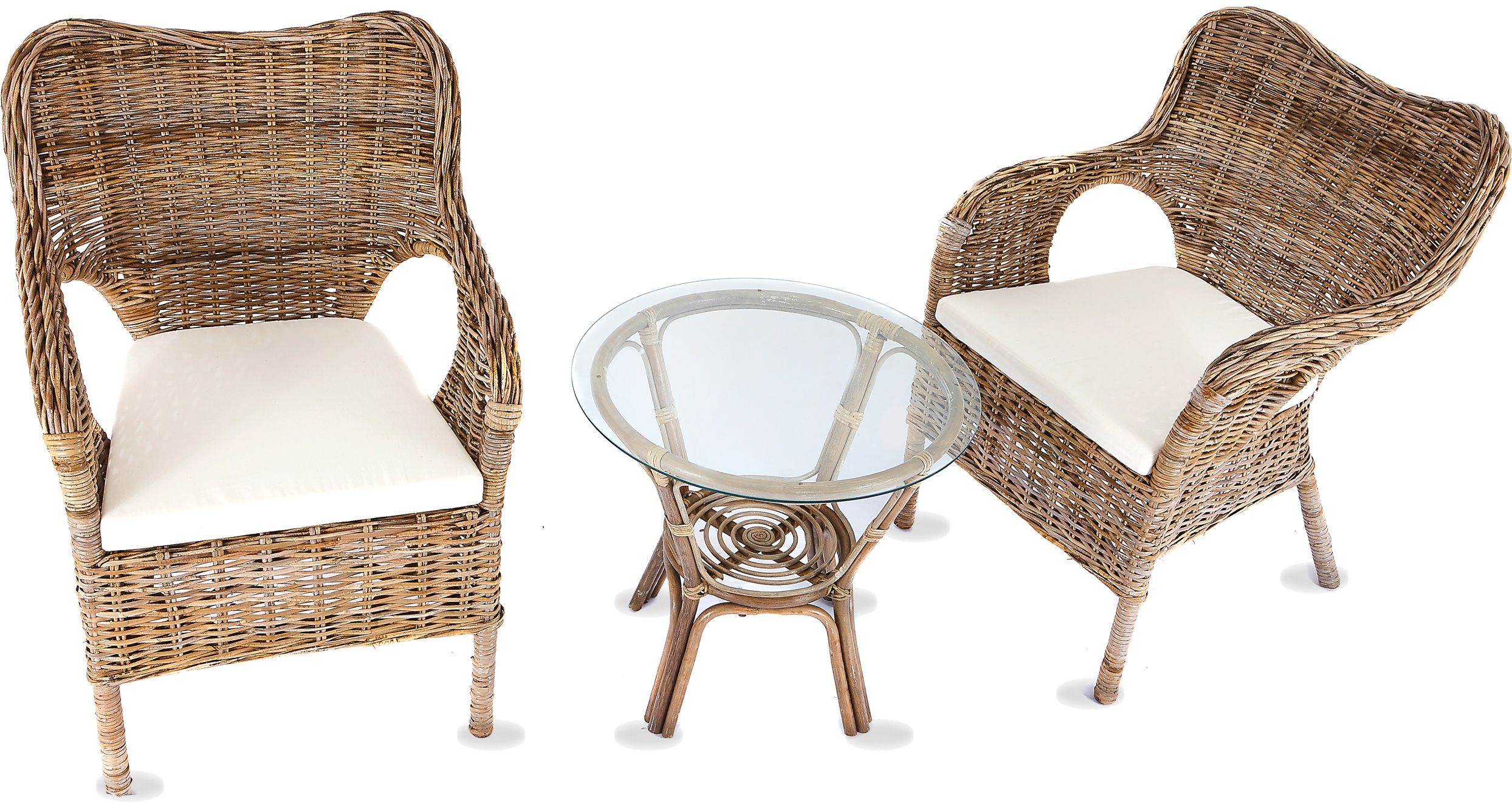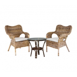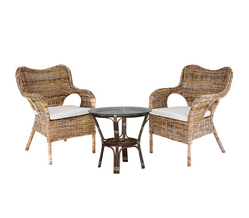 Kolekce obsahuje 2 ratanová křesla s ratanvým výpletem a ratanový stolek se skleněnou deskou. Stolek má ve spodní části plochu na ukládání drobných věcí.
