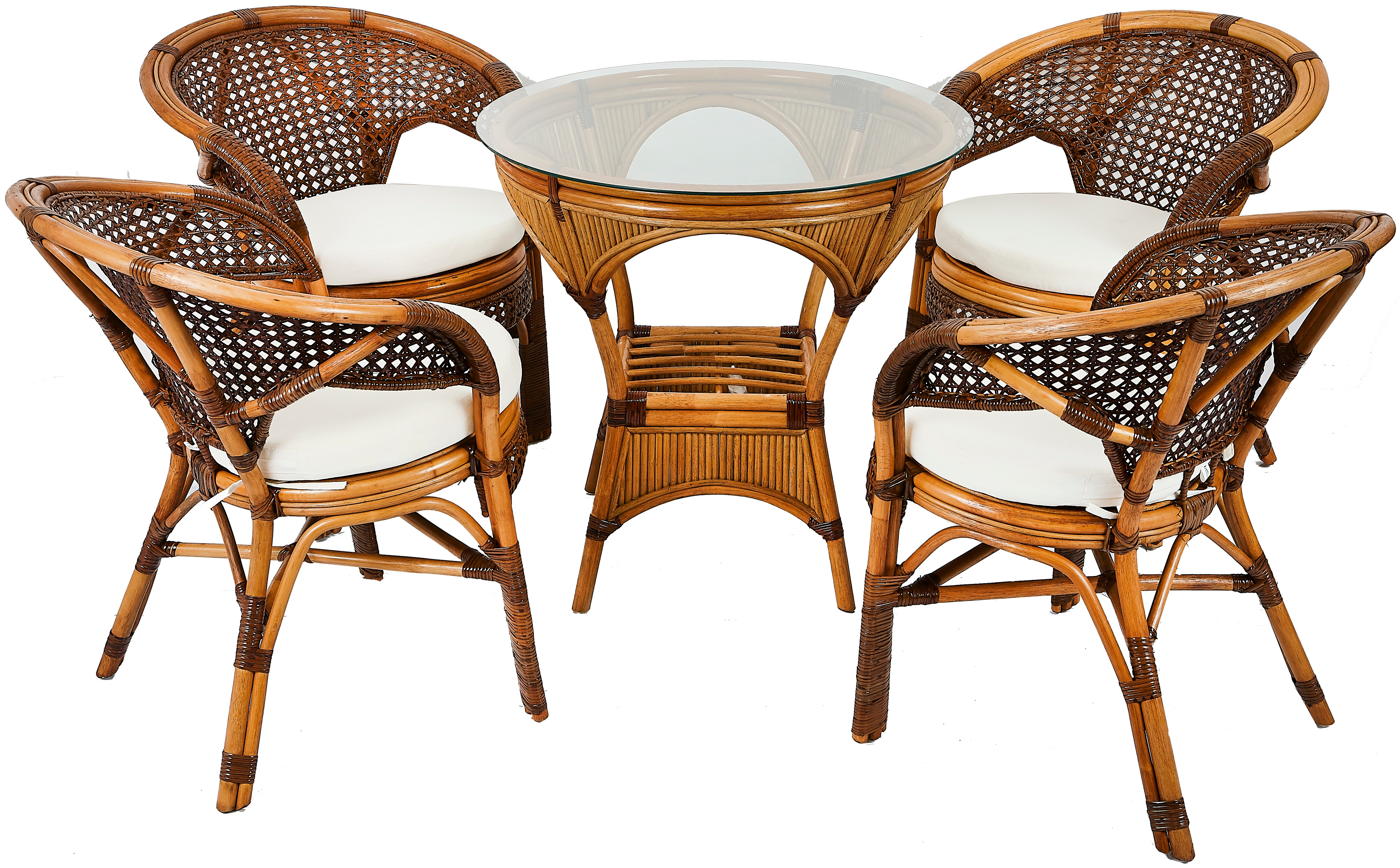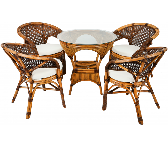 Kolekce obsahuje 4 ratanová křesla a ratanový stolek se skleněnou deskou. Stolek má ve spodní části plochu na ukládání drobných věcí.